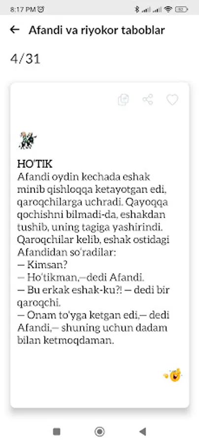 Afandi latifalari haqida o‘z fikringizni bildirish va hikmat va ma’rifat izlovchi hamkasblaringiz bilan o‘rtoqlashish uchun baho bering va sharh yozing.
