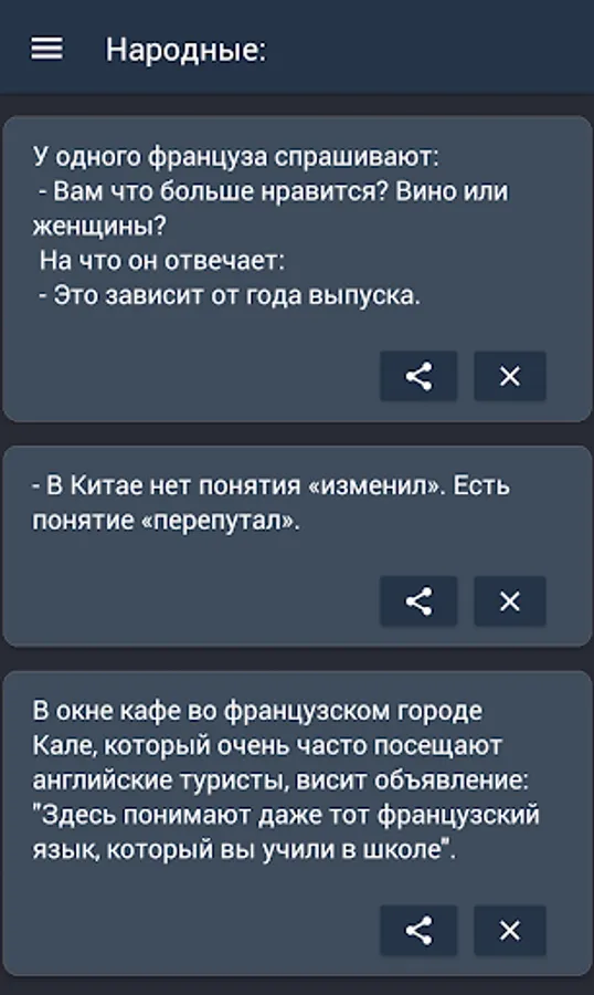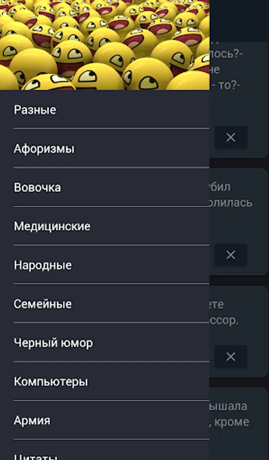 Collection of jokes and aphorisms on various topics. You can choose any of the categories: Alcoholics, Army, Aphorisms, Bearded, Little Johnny, Travelers, Friends, Animals, Foreigners, Intimate, Movie Heroes, Computers, Crime, Medical, Police, Drug Addicts, People’s, New Russians, Politics, Lieutenant Rzhevsky, Pro Bill Gates, About money, About children, About Jews, About women, About men, About programmers, About Putin, About a system administrator, About students, About a mother-in-law, Different, Advertising, Family, Fairytale, Soviet, Sports, Judicial, Quotes, Black humor , Chukchi, School, Show business, Stirlitz.