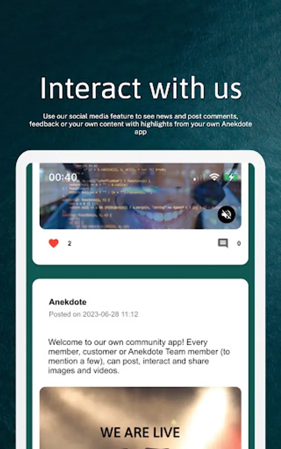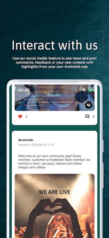 Inside the app, news about the latest releases, events and other important developments will be published in order to keep the users updated with the latest information. They are also able to interact in our own social media feature, where they can view, record, upload, like and comment on the posted images and videos.