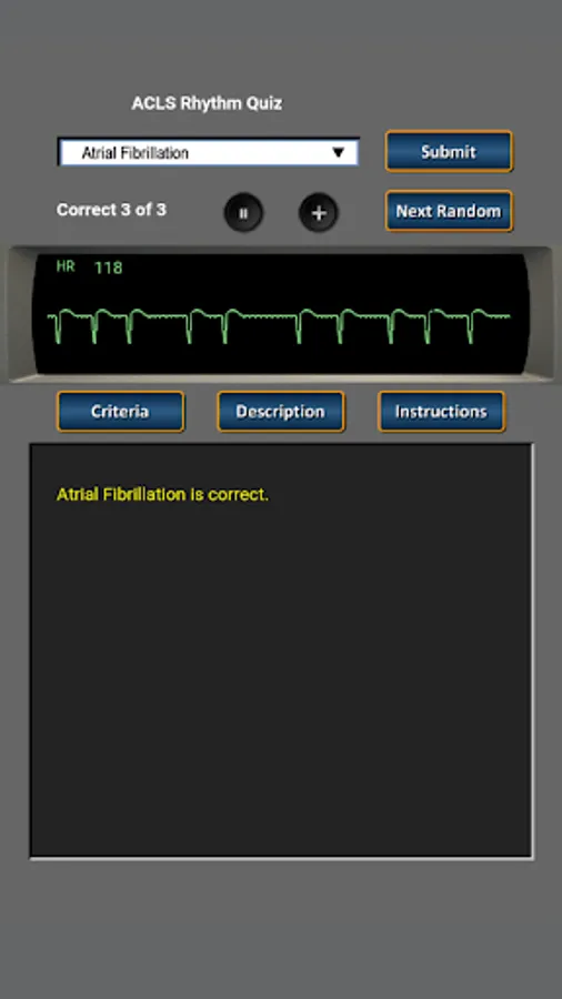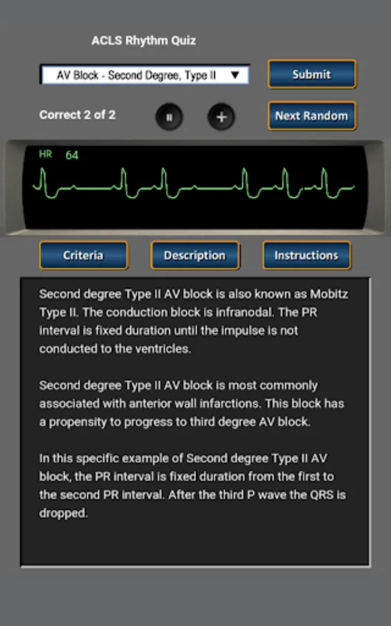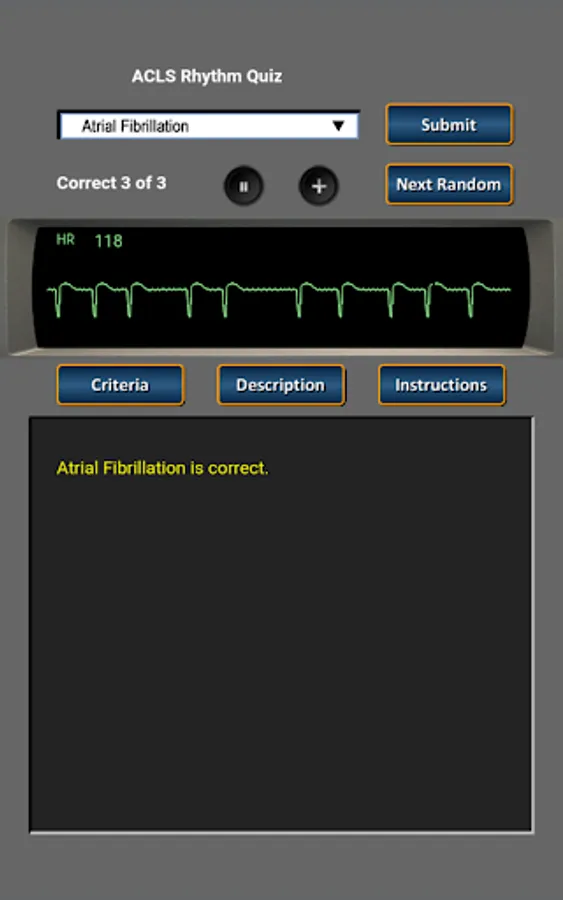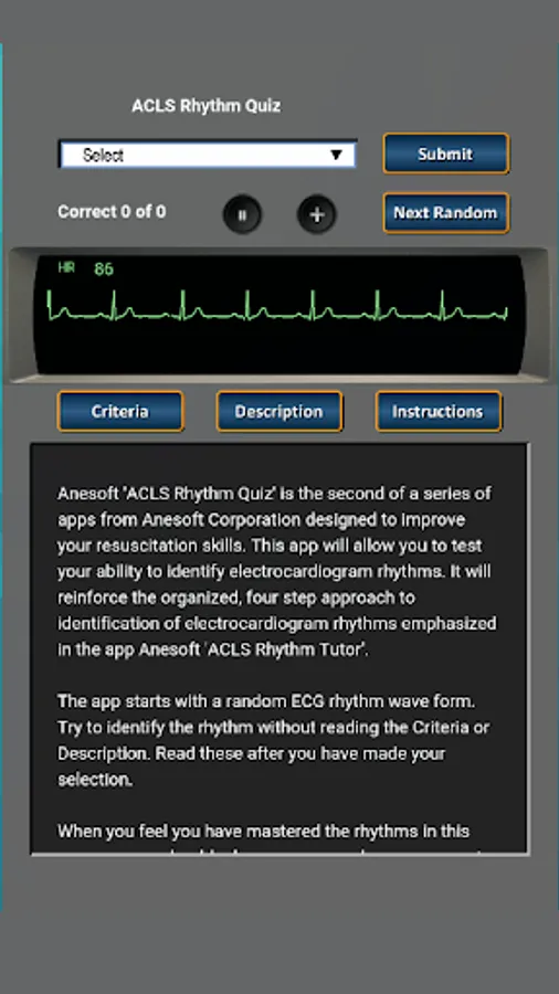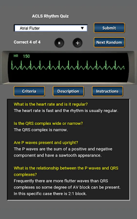 The app utilizes an organized four Criteria approach to identify the rhythms. You can also study the Description of the rhythm to review the electrophysiology. Use the same process to test yourself and review all the ECG rhythms.
