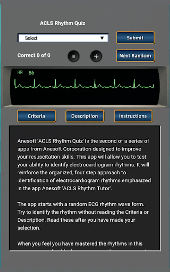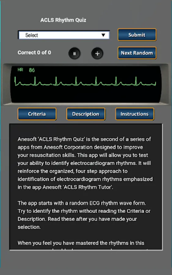 Anesoft 'ACLS Rhythm Quiz' is one of the series of apps from Anesoft Corporation to improve your ACLS resuscitation skills. This app will test your ability to identify electrocardiogram rhythms. Recognition of ECG rhythms as the wave forms sweep across a monitor screen is a different skill than diagnosing cardiac rhythms on a static tracing. This app will evaluate your resuscitation skills better than reviewing with a book because you have to diagnose the rhythms as they dynamically move across the screen.