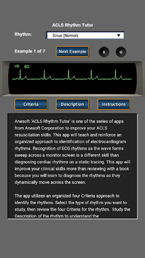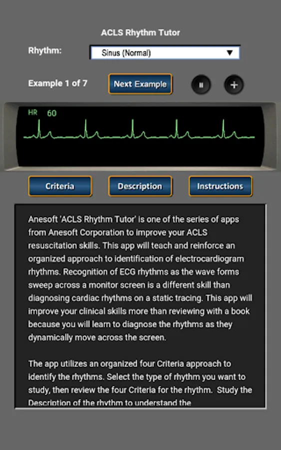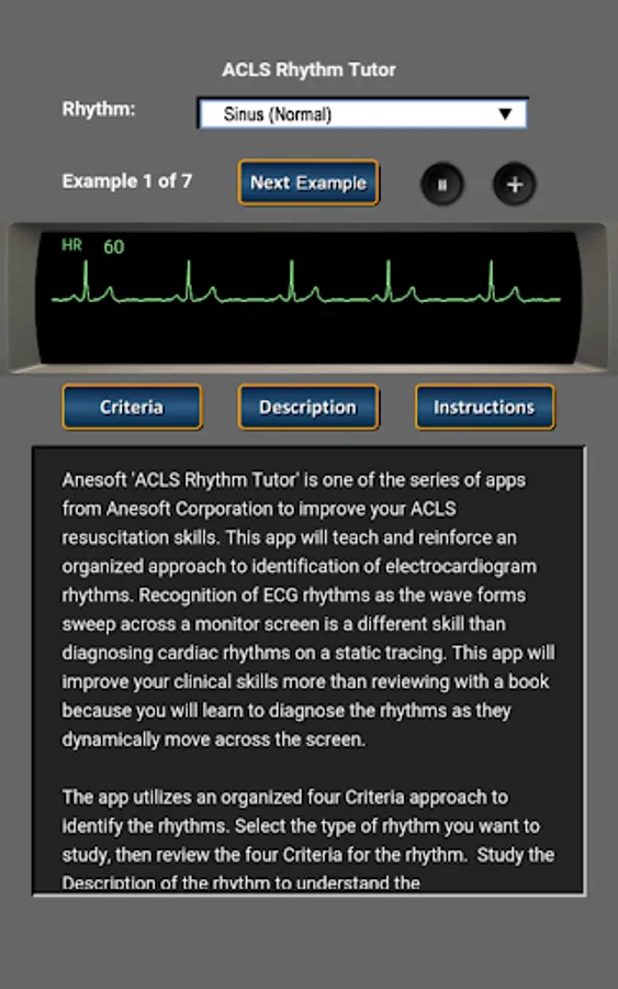 'Anesoft ACLS Rhythm Tutor' is one of the series of apps from Anesoft Corporation to improve your ACLS resuscitation skills. This app will teach and reinforce an organized approach to identification of electrocardiogram rhythms.