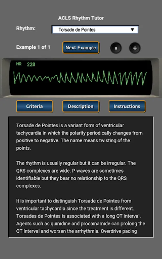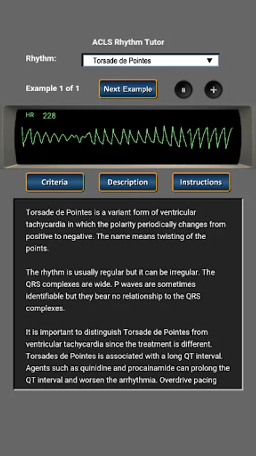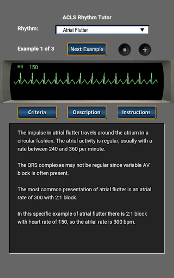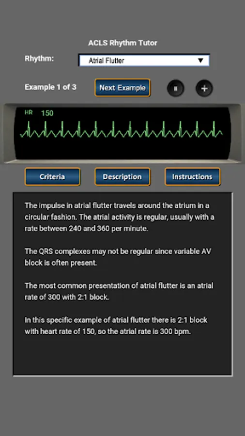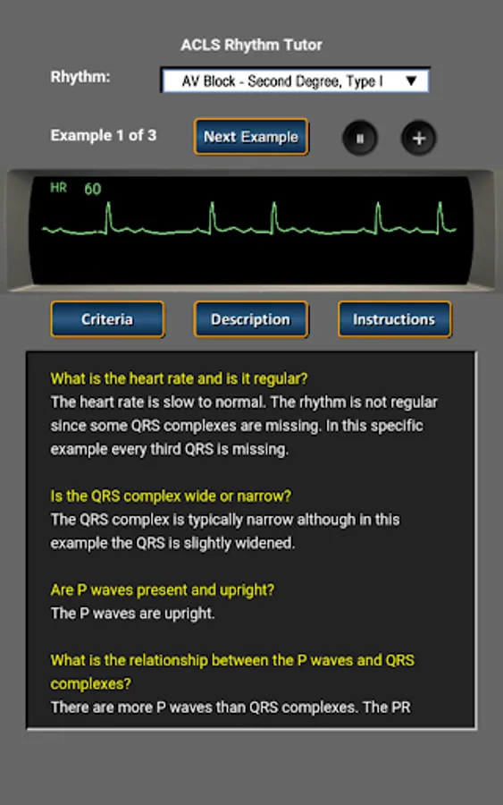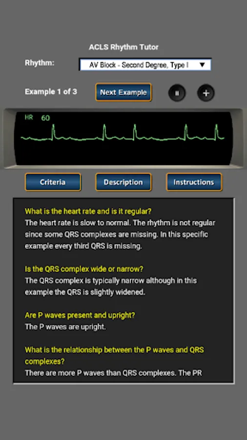The app utilizes an organized four criteria approach to identify the rhythms. Then study the description of the rhythm to understand the electrophysiology. Use the same process to review all the ECG rhythms.