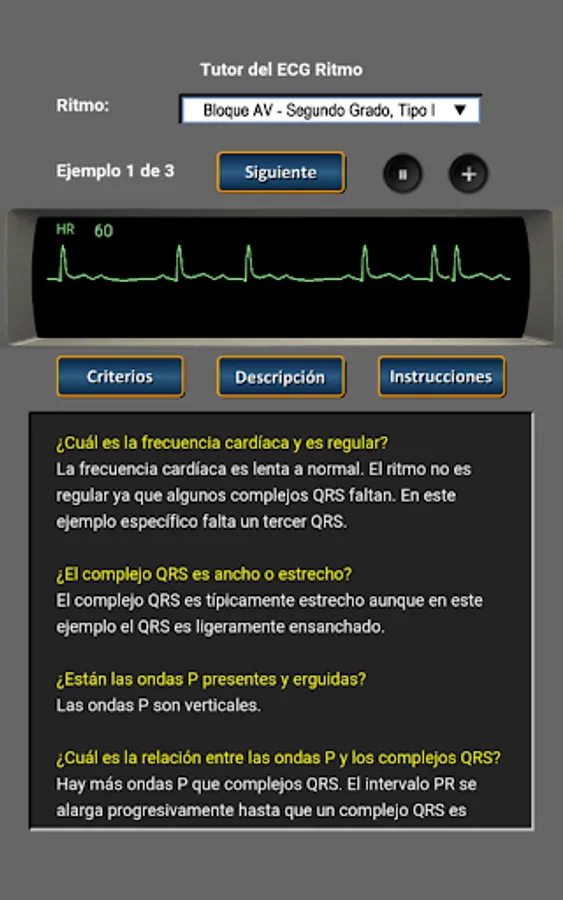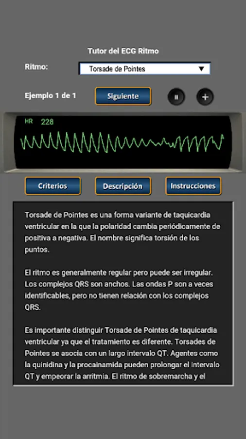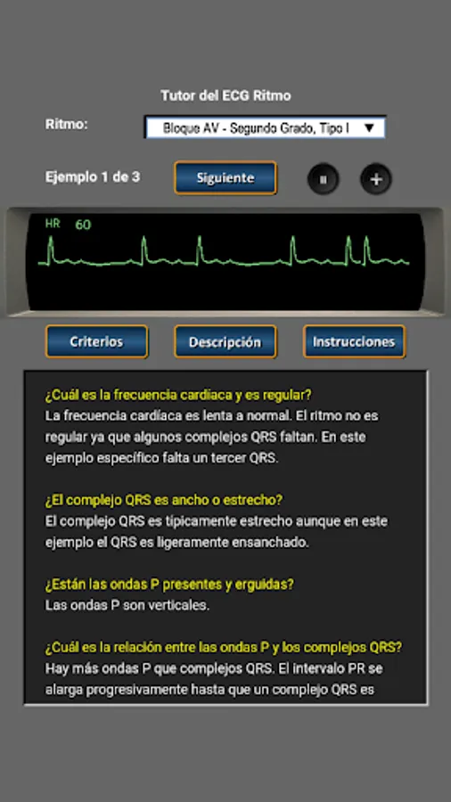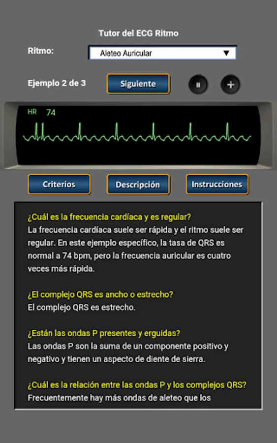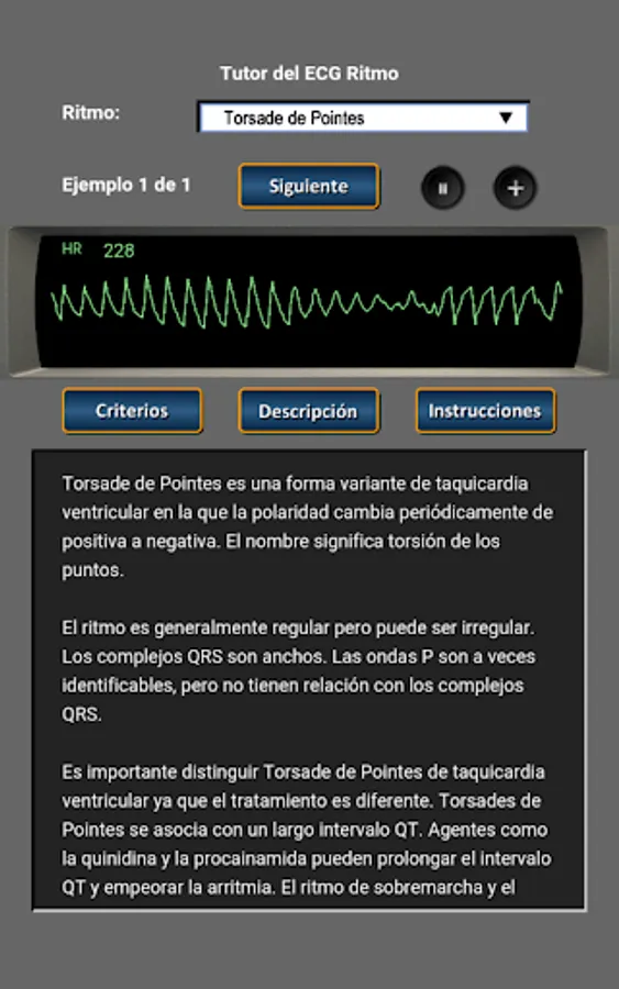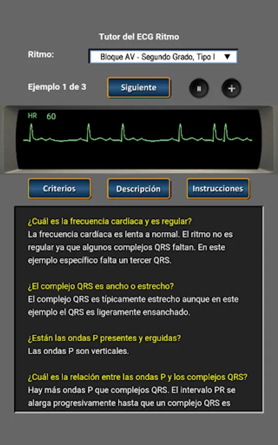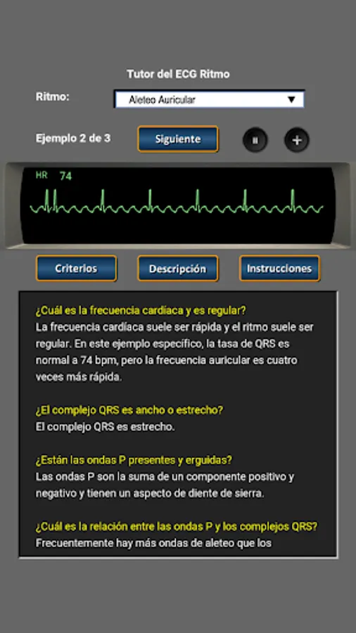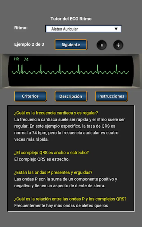 The application uses an organized criterion of four criteria to identify the rhythms. Next, study the rhythm description to understand electrophysiology. Use the same process to check all ECG rhythms.
