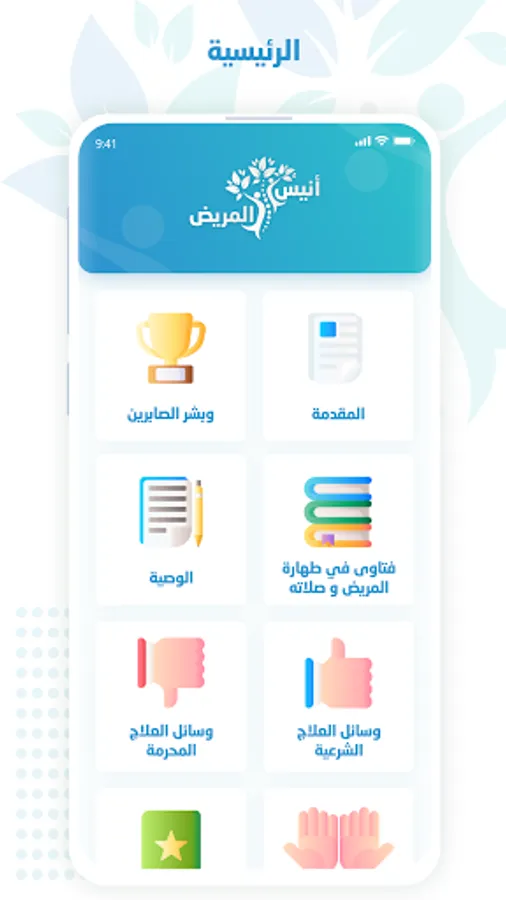 Anees Al-Mudfa app is an adjustable content owned by the Religious Awareness Department of Aseer Health - Kingdom of Saudi Arabia. The application provides the patient with all the information he may need in light of the Sharia rulings, the application includes many things that the patient may need in light of the Sharia rulings such as the provisions of the patient’s purity, the provisions of the patient’s prayer, many aspects related to the will, repentance and its conditions in addition to the legal treatment methods such as Medication, supplication, Zamzam water, and legal ruqyah, whether in the Holy Qur’an or in the purified Sunnah. By downloading or using the application, you are considered agreeing to these terms and instructions, which makes us ask you to read them carefully before starting to use the application. The use of the application is on a personal level without any financial costs and it is not allowed to try to make a copy of the application without referring to the owner of the application. We are committed to providing everything necessary for the success of the application and its development, and we reserve the right to make any changes within the application at any time for any reason. There will be no financial costs for using the application. The app does not include any betting or gambling for using the app.