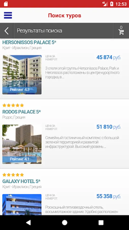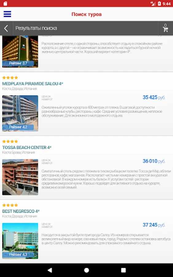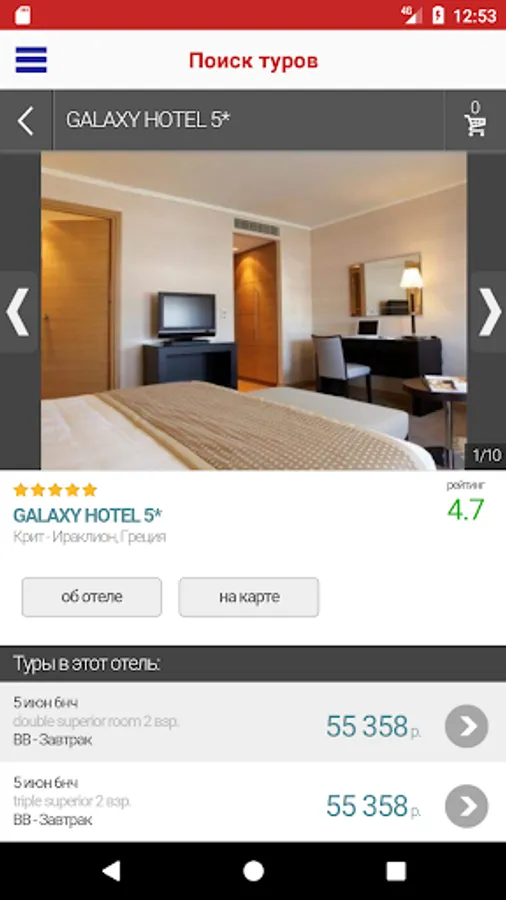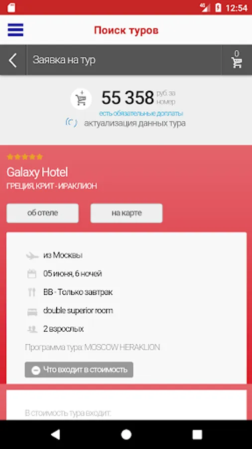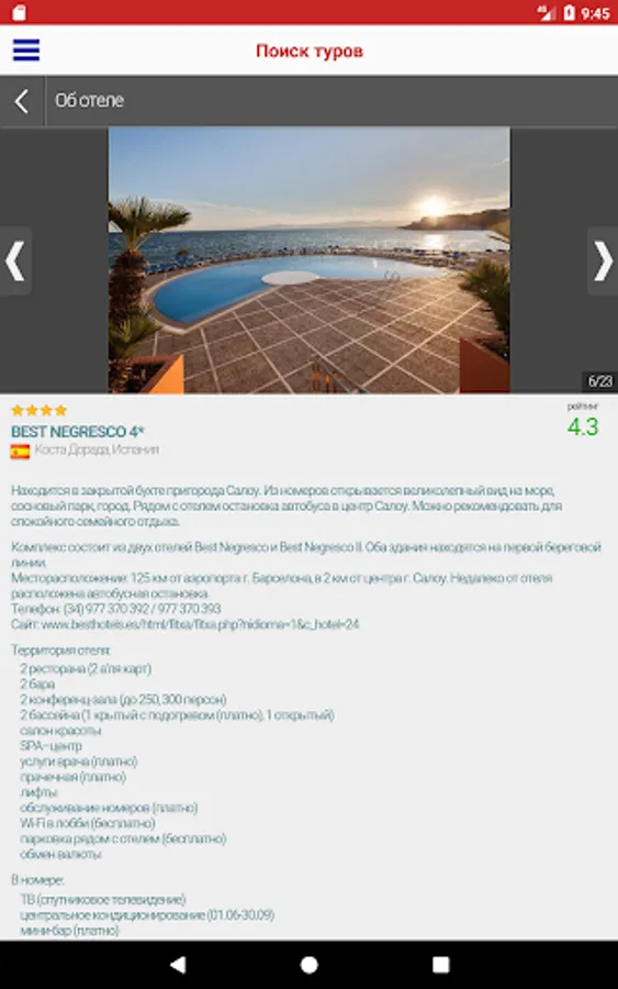 - view photos of the hotel, find out its location, room type and meals for the selected tour;