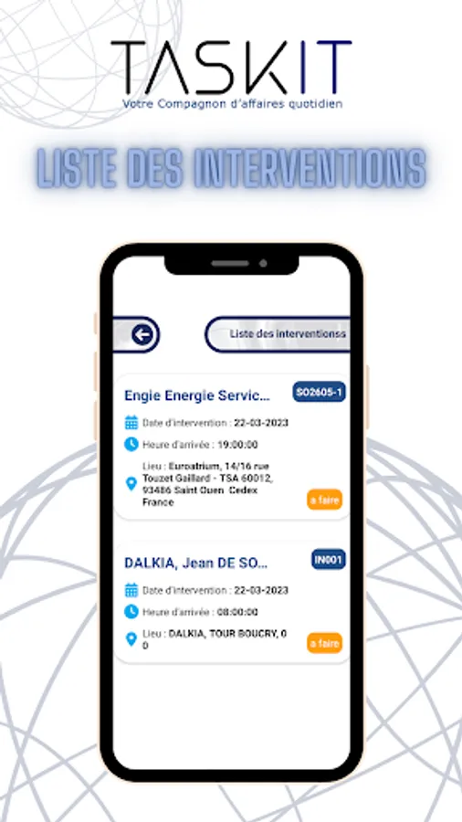 Taskit is a simple and intuitive application that allows you to simplify the planning and management of your field interventions, while increasing your productivity. Thanks to our solution, you can plan your interventions by saving time and optimizing your productivity. Taskit's automatic scheduling tunnel facilitates the processing of your interventions, allowing you to efficiently manage your schedules, technicians and teams. Our application offers real-time synchronization, allowing you to access data relating to interventions and the database of customers registered with your customer. Simplify the planning of your interventions with Taskit and optimize your productivity now.