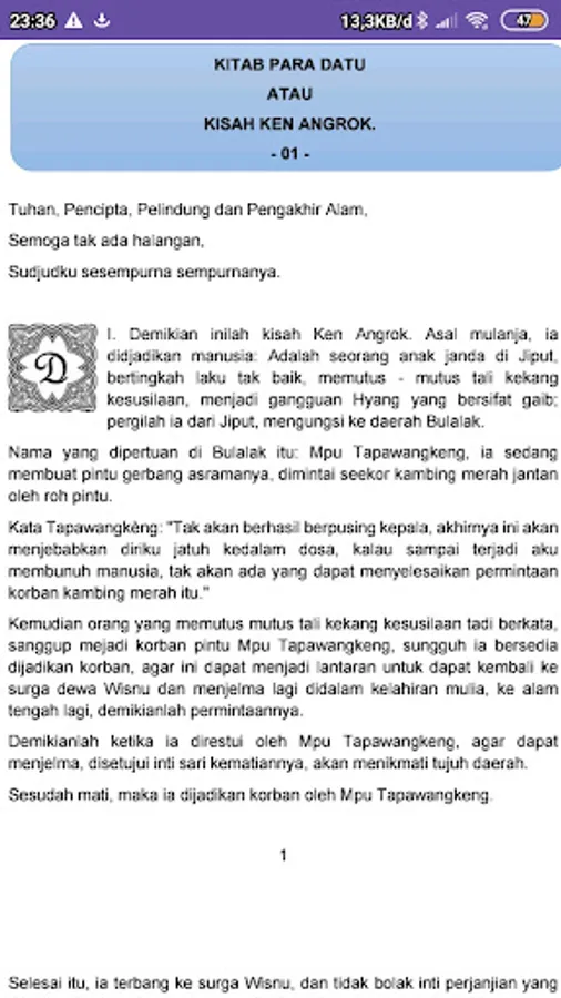 The emphasis on the importance of Ken Arok's story is not only expressed through the length of the story, but also through the alternative titles offered in this manuscript, namely: "Serat Pararaton or Katuturanira Ken Angrok", or "Book of Kings or Stories About Ken Arok". Given that the oldest known date on the sheets is 1522 Saka (or 1600 AD), it is thought that the last part of the text was written between 1481 and 1600, which is more likely closer to the first year than the second.