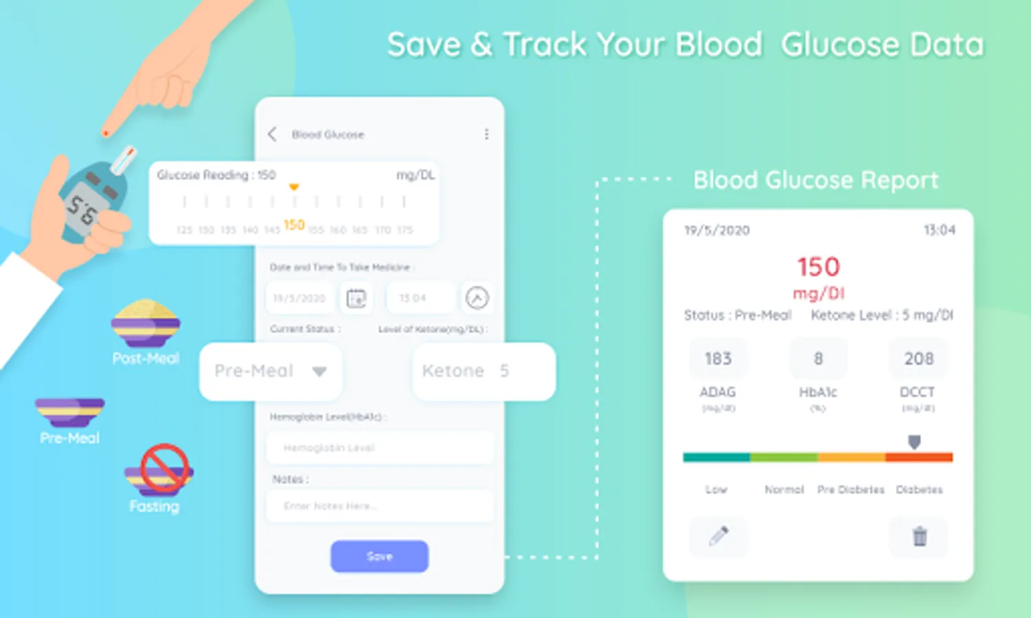 Enter your glucose value taken at Pre-meal, Post-meal, Fasting or General to record blood glucose.