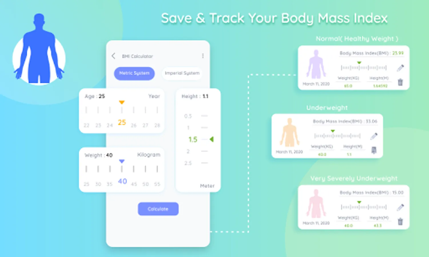BMI Calculation according to Metric System or Imperial System using age, weight & height.