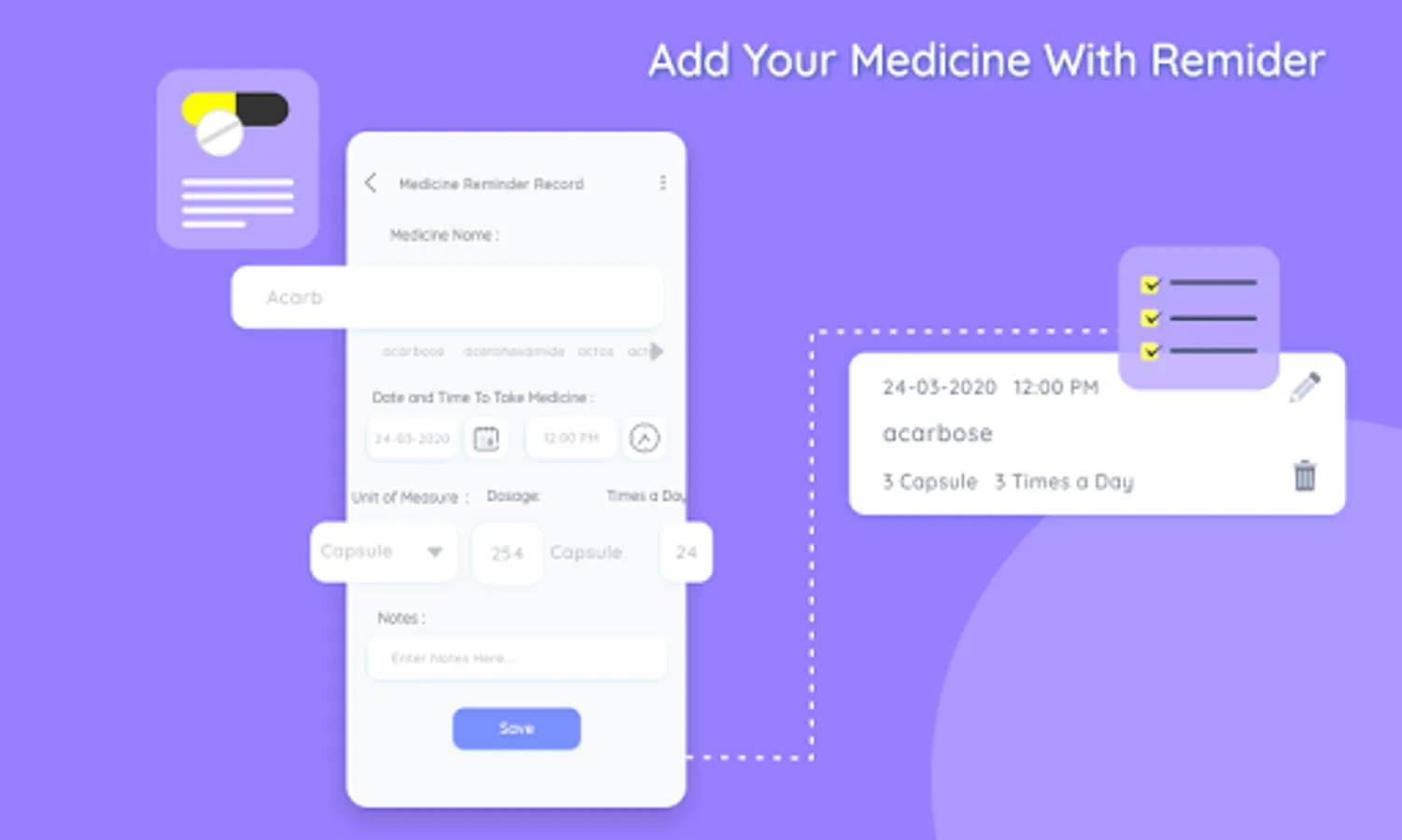 Set reminder time, title, description, reason and select days on which you want reminder.