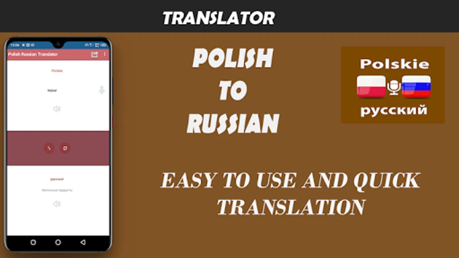 It is FREE app to translate polish to Russian. With this app you can also translate complex sentences. Polish to Russian translation app can translate in split seconds. You can also translate from clipboard. Translate polish to Russian app is helpful to learn languages. It does not required login information to access this app.