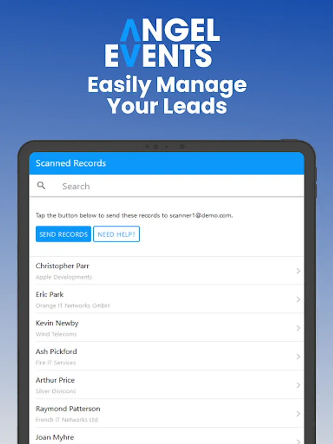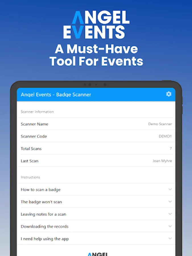 This app is used in connection with the Angel Events badging and registration system to securely obtain attendee details using QR codes.
