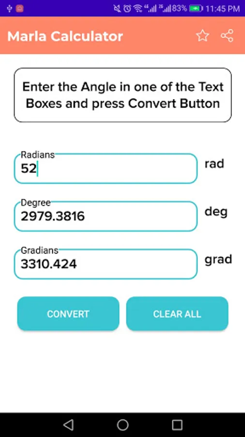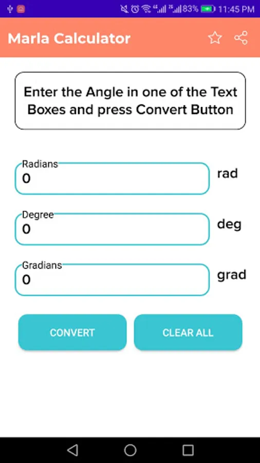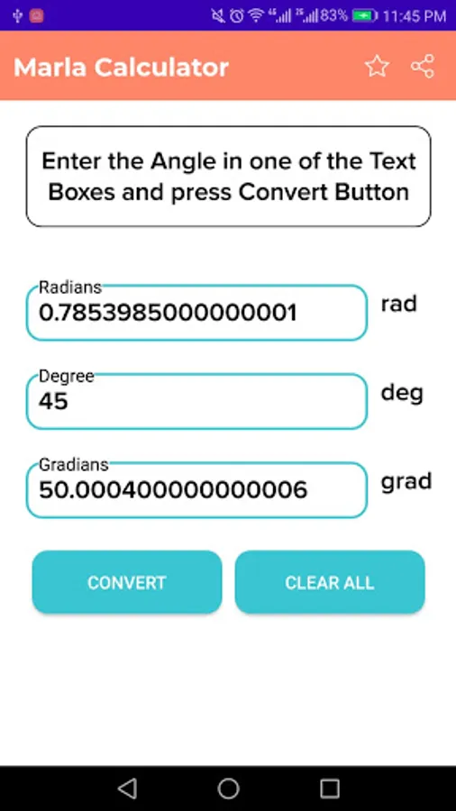 A easiest way of conversion of different angle units,you simply enter one form angle and our app will calculates different likes as radian or gradian or degree angle units. All measures are interchangeable or inter convertible.