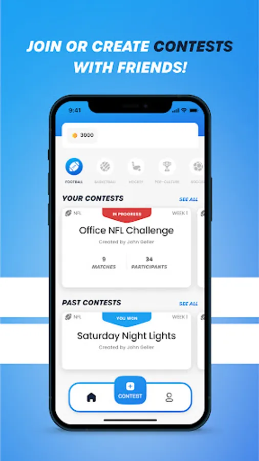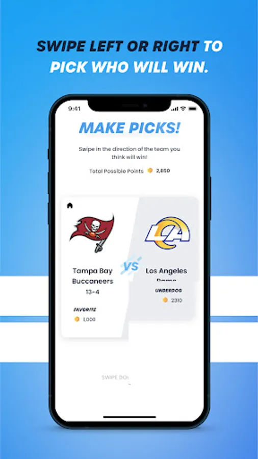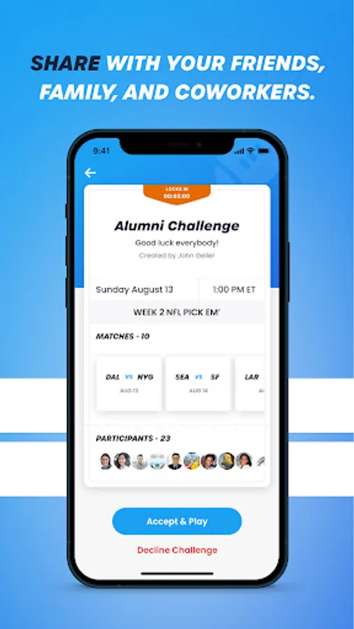 - Quickly join or create fun and simple pick em' games to share and compete with friends, family, and co-workers during live sports events, including NFL and coming soon NBA