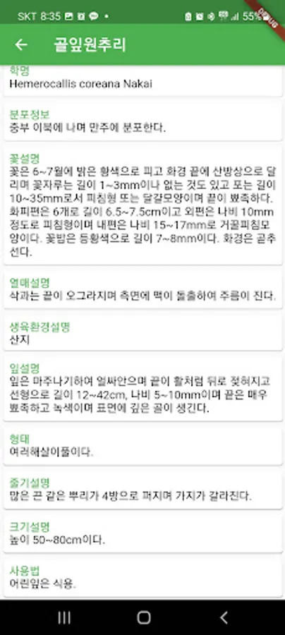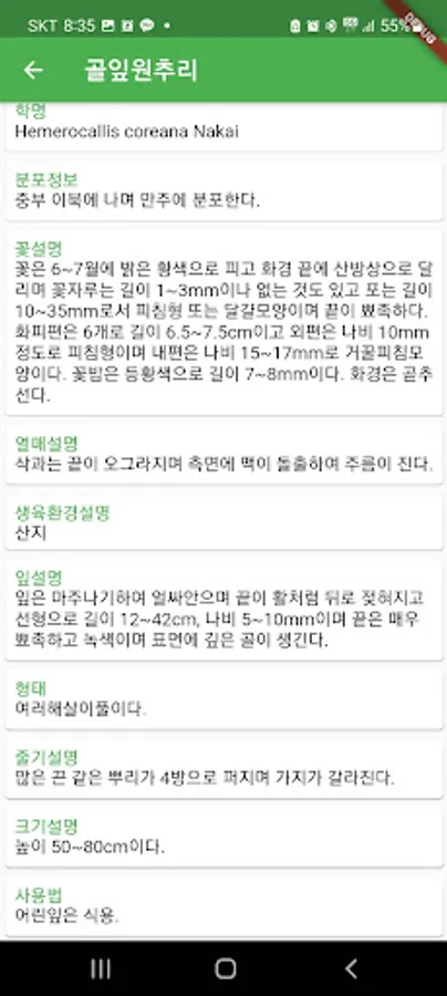 Country name, English name, family name, family name, genus country name, genus name, scientific name, distribution information, overseas distribution, breeding method, flower description, fruit description, growth environment description, leaf description, root description, growth type, similar plant information, characteristics, It provides stem description, usage, and image information.