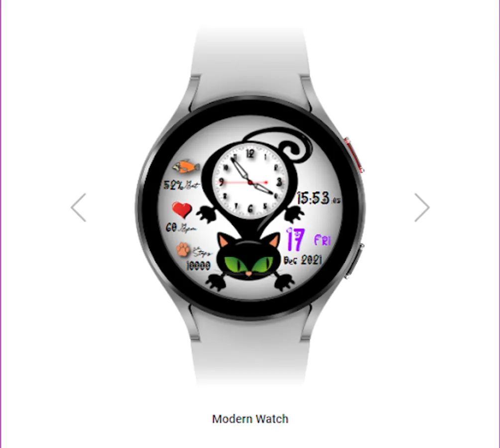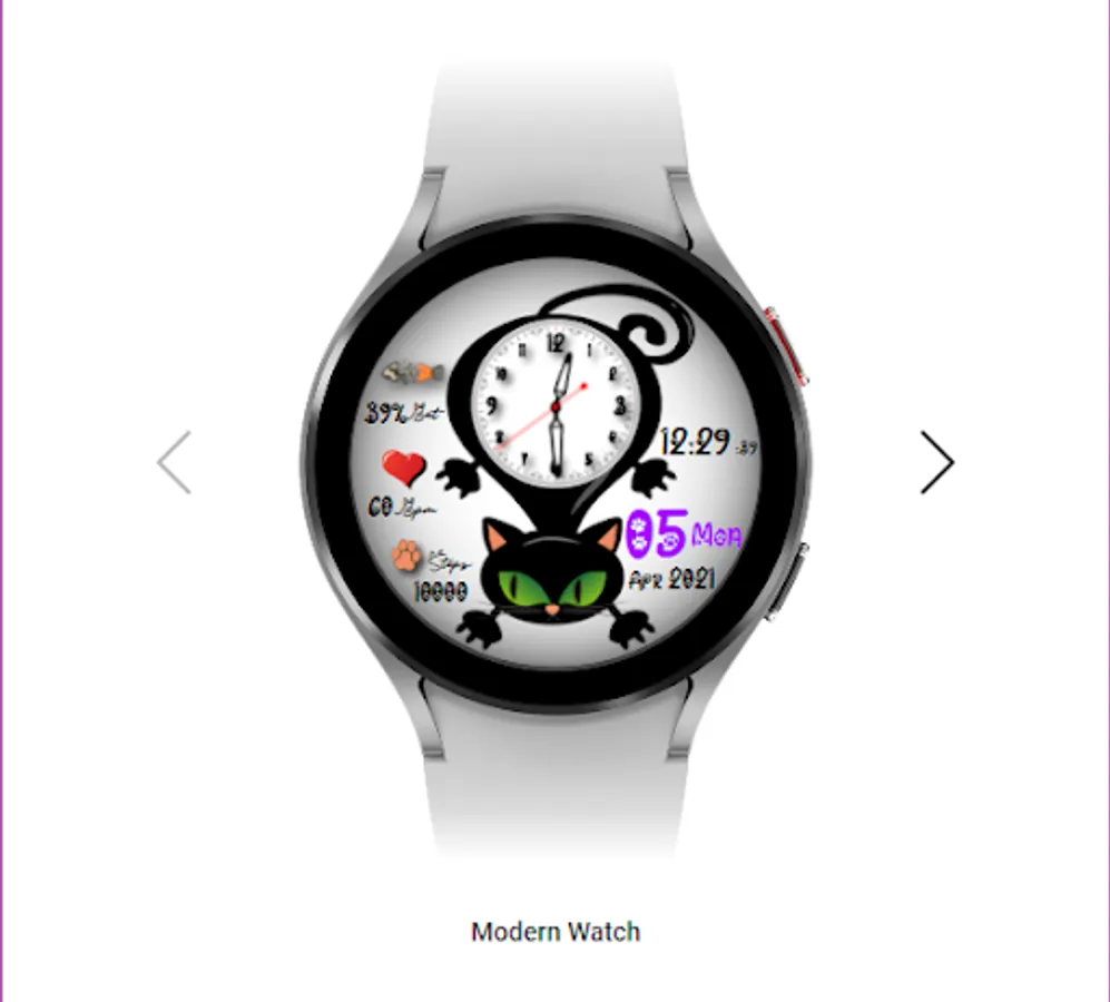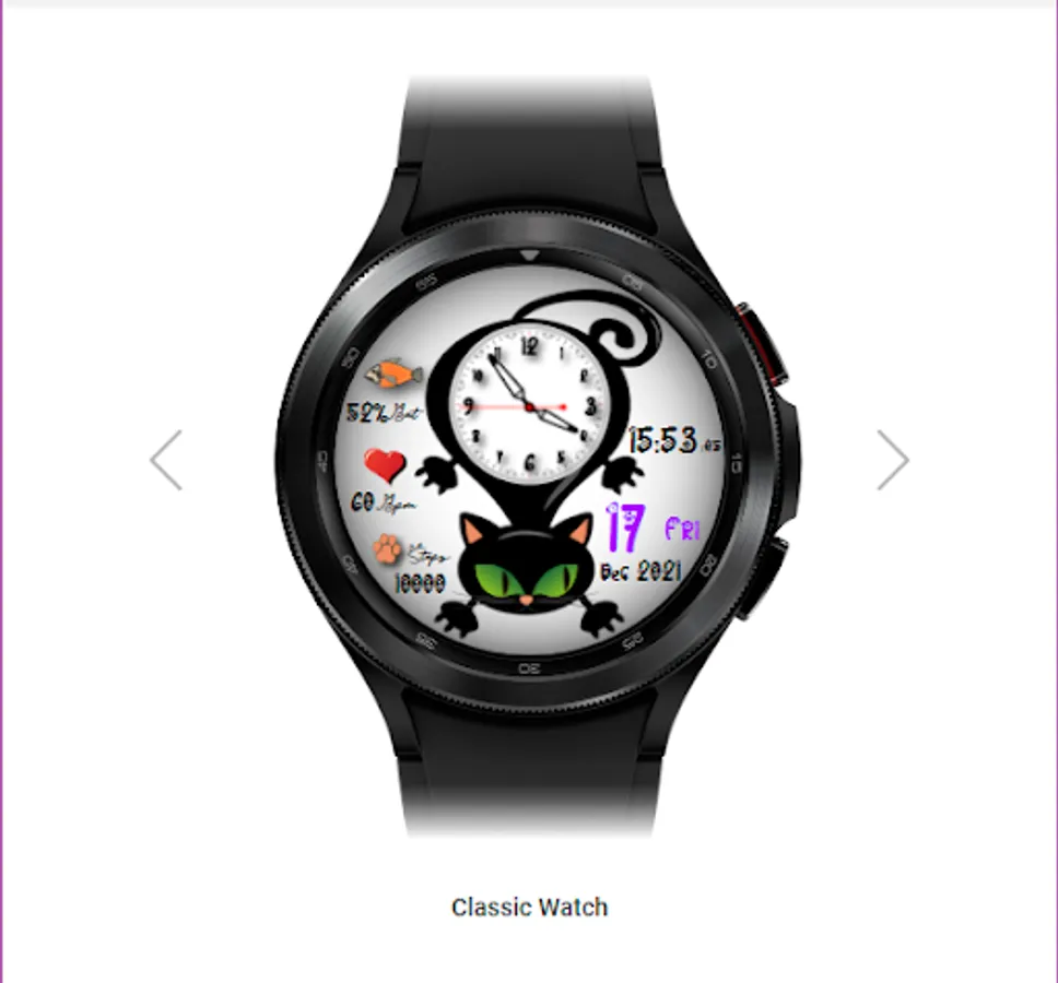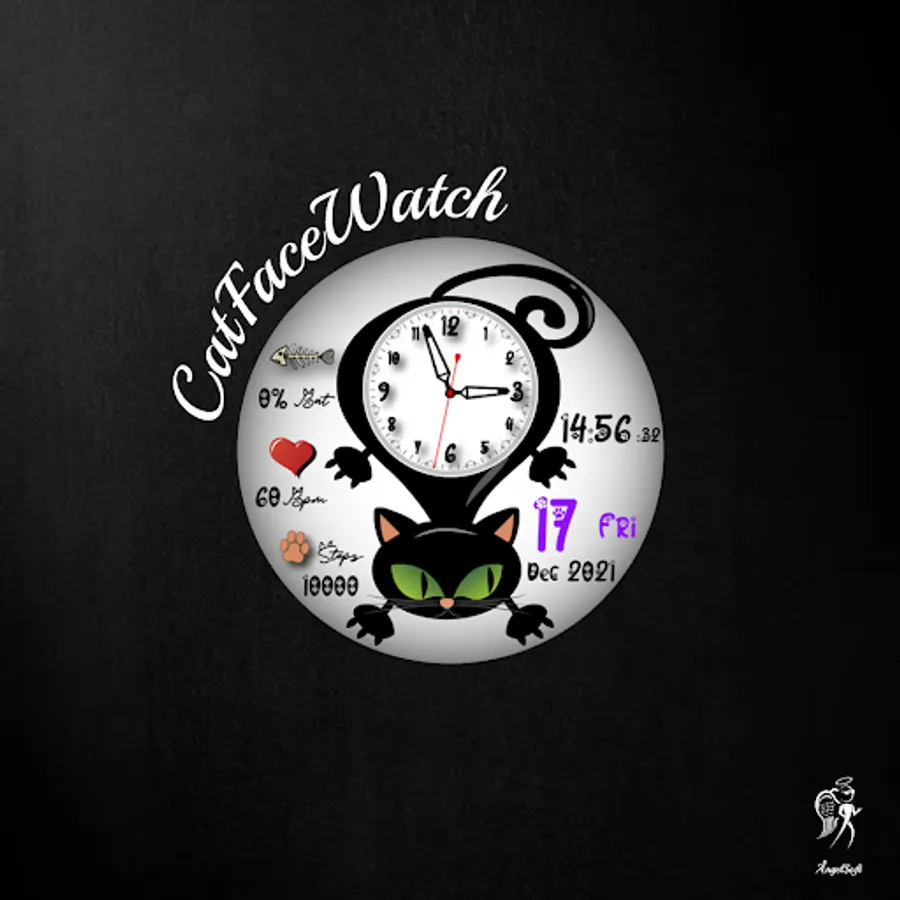 CatFaceWatch Caratula Felina Animada, es una hermosa caratula para reloj, que cuenta con un estilo enfocado a los amantes de los gatos. Una caratula animada y divertida con la que podrás saber la hora pues cuenta con una esfera de reloj análoga en la barriguita del felino, sus ojos están animados sincronizados con el segundero del reloj, cuenta con un reloj digital y también con indicador de fecha el cual proporciona información del día del mes/semana, indicador de mes y año por medio de los cuales se puede acceder a la app de gestión de Calendario. Cuenta también con un Indicador de Porcentaje de Batería a través del cual podrás conocer el estatus actual de tu batería al igual que podrás saber tu actividad por medio de los Indicadores de Heart Rate animado y Contador de Pasos que tu dispositivo a censado, es un divertido reloj gatuno.
