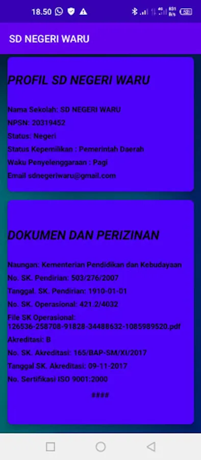 This application is to make it easier for students to find information about SD Negeri Waru. Such as the name of the school, NPSN, to Email