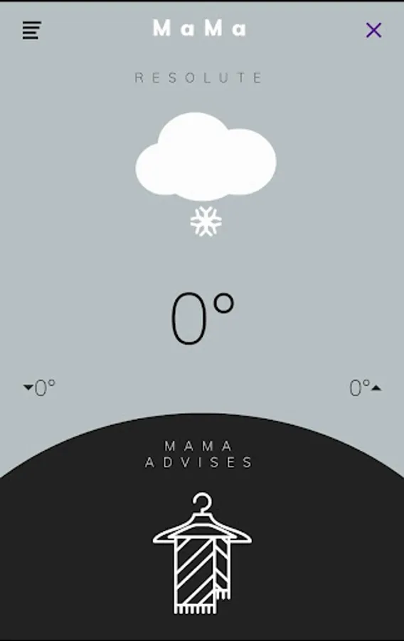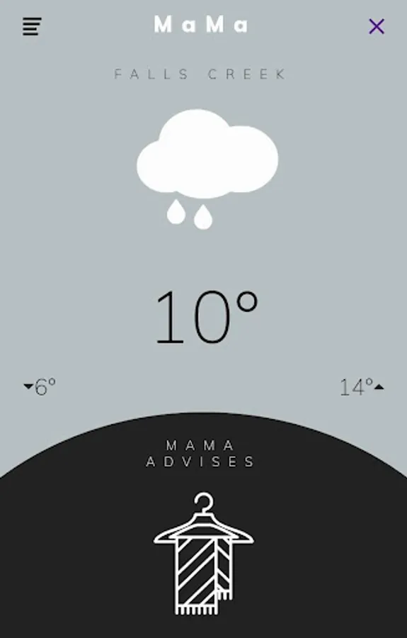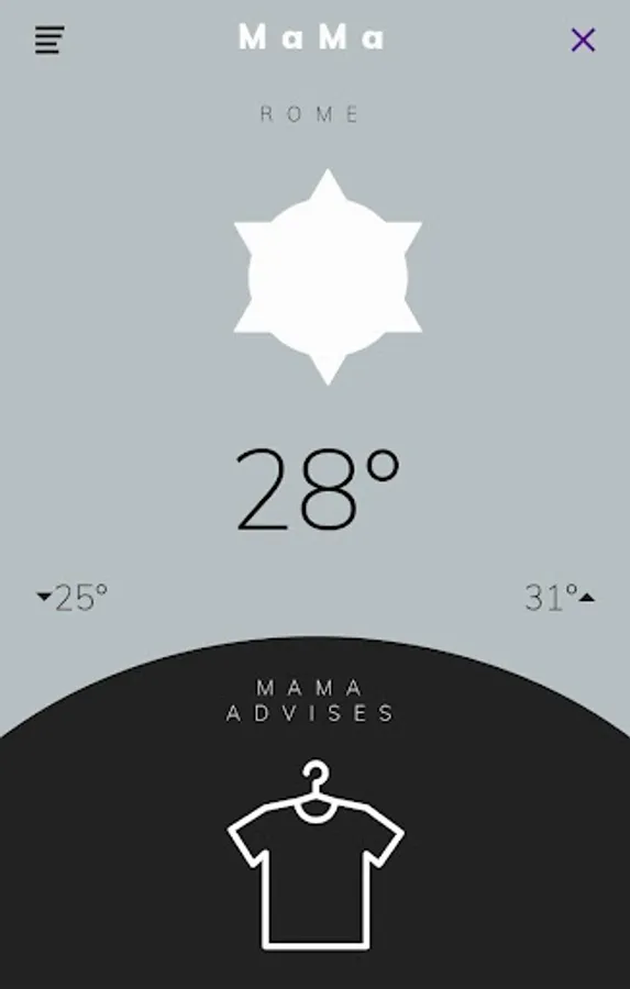 It shows current Temperature, Weather, and min max temperatures of the day. "Mama" advises you what you should wear, a simple t-shirt or a warm scarf if Temperature is below 18 degrees.