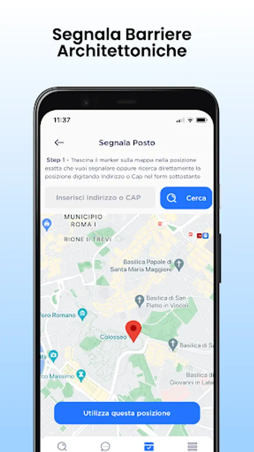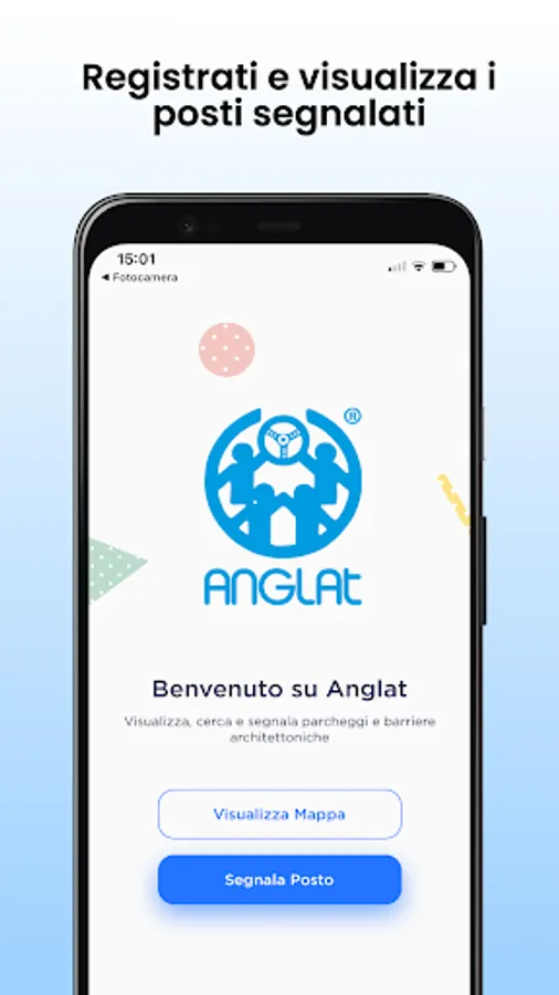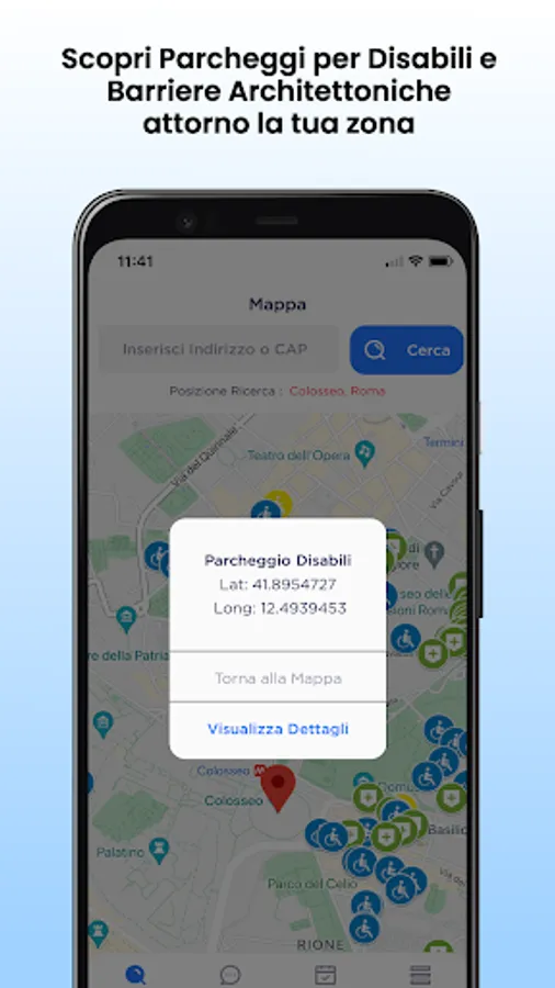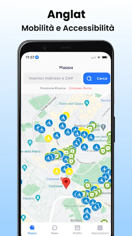 With Anglat - Mobility and accessibility you can search for all disabled parking spaces (with and without concession) and architectural barriers around your area. The service is initially active in Rome, but you can notify us of parking lots and architectural barriers via app in your area so that we can intervene with the nearest Anglat office and involve the bodies responsible for solving the problem.