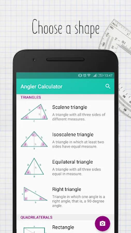 Angler is a great tool that can help you with learning geometry and maths. It offers quick, step by step solutions to geometry problems. You only have to use your smartphone's camera, scan the geometric shape and write in the length of one of its sides and it will calculate the rest!