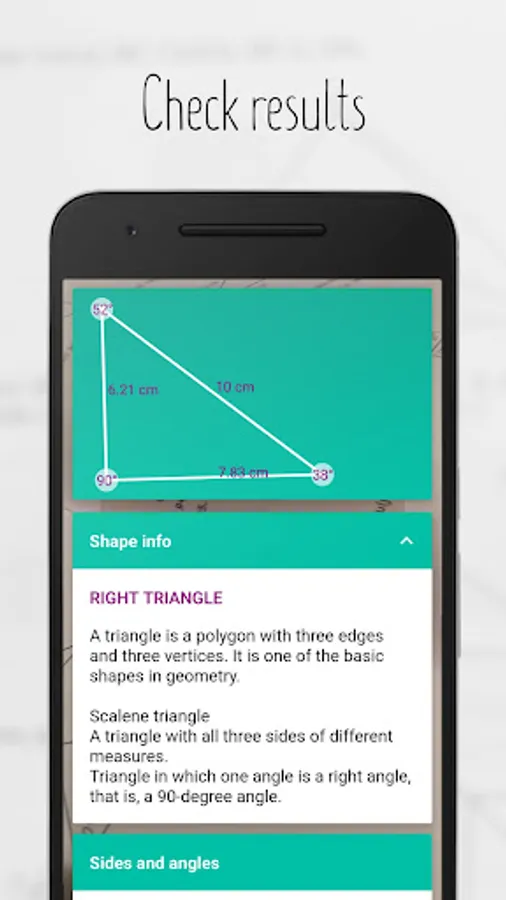 Angler works like a visual calculator - it uses mobile vision and machine learning techniques to recognise the angles in a shape and then calculates its side lengths, area and parameter. It provides mathematical formulas needed for these calculations. The user can transform the shape by dragging its angles.