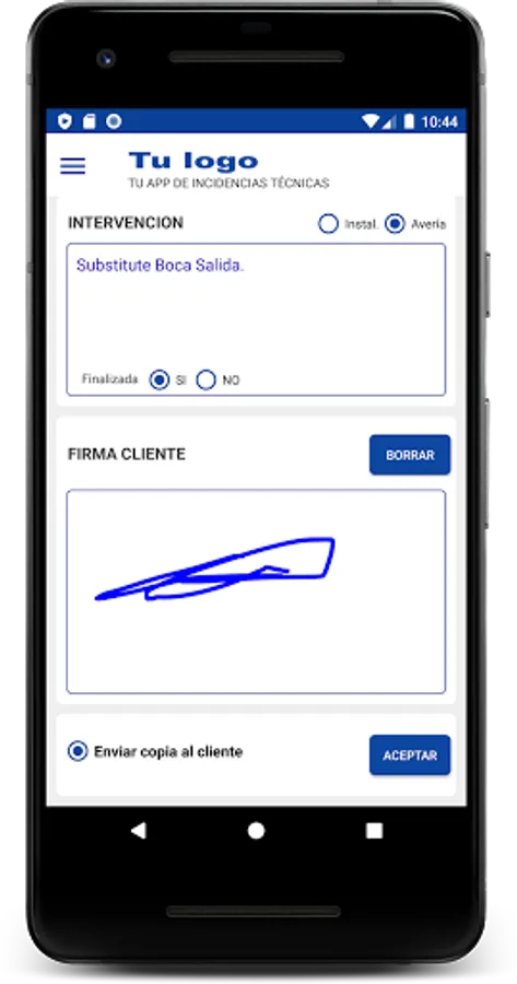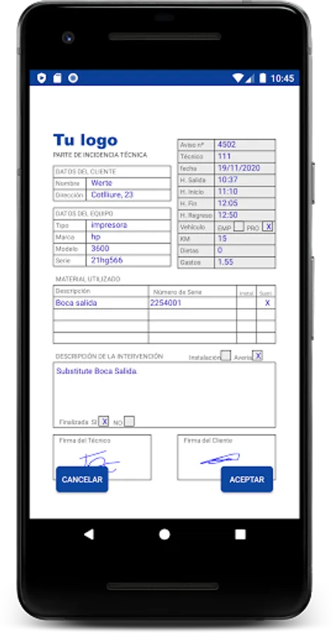 Forget filling in the parts on paper. With this APP you can fill in the part on the phone with the signature of the technician and client and send it to your server.
