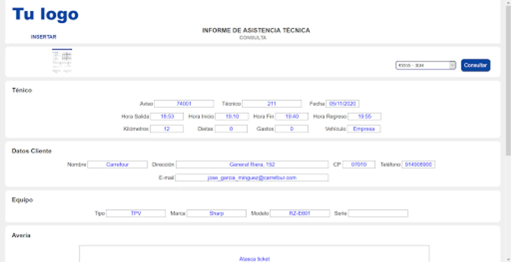 From the APP you download the fault from your server on the phone and you have just filled it in with the data of the technical intervention. Once done, the data and an image of the part are sent to the server. Optionally, a copy of the part can be sent to the client's email and to your delegation by mail.