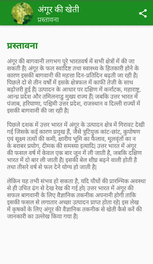 अंगूर की बागवानी लगभग पूरे भारतवर्ष में सभी क्षेत्रों में की जा सकती है| अंगूर के फल स्वादिष्ट तथा स्वास्थ्य के हितकारी होने के कारण इसकी बागवानी की महत्ता दिन-प्रतिदिन बढ़ती जा रही है| पिछले दो से तीन वर्षों में इसके क्षेत्रफल में काफी तेजी के साथ बढ़ोत्तरी हुई है| उत्पादन के आधार पर दक्षिण में कर्नाटक, महाराष्ट्र, आन्ध्र प्रदेश और तमिलनाडु मुख्य राज्य हैं| जबकि उत्तर भारत में पंजाब, हरियाणा, पश्चिमी उत्तर प्रदेश, राजस्थान व दिल्ली राज्यों में इसकी बागवानी की जा रही है|