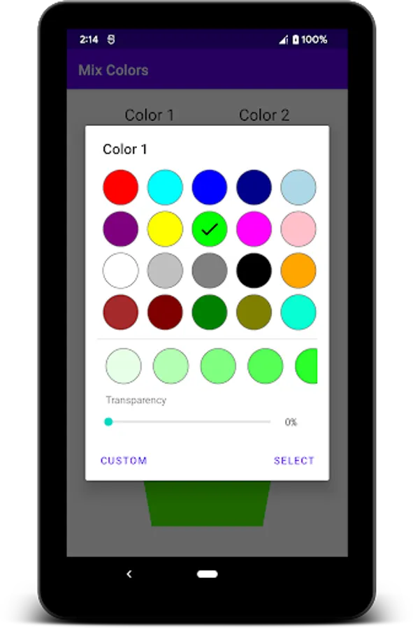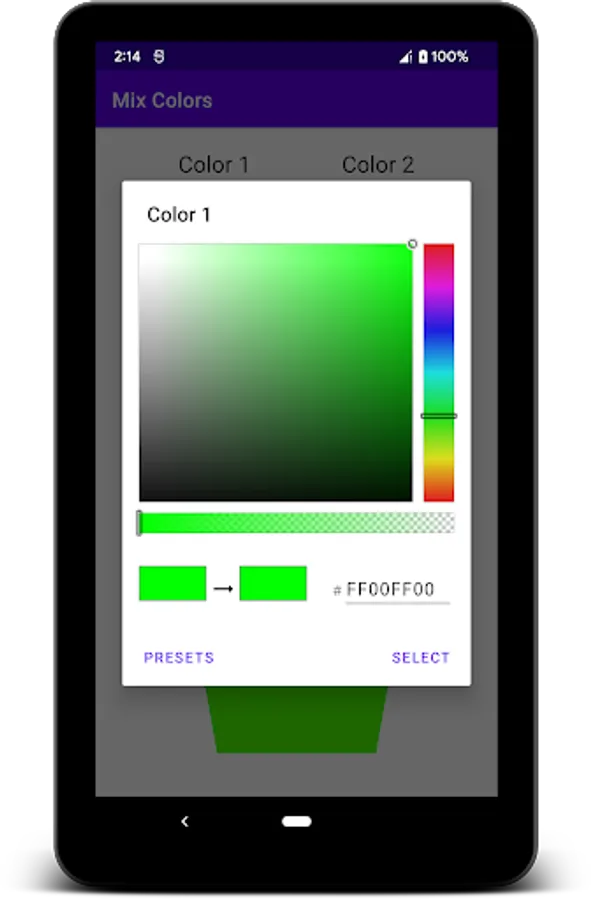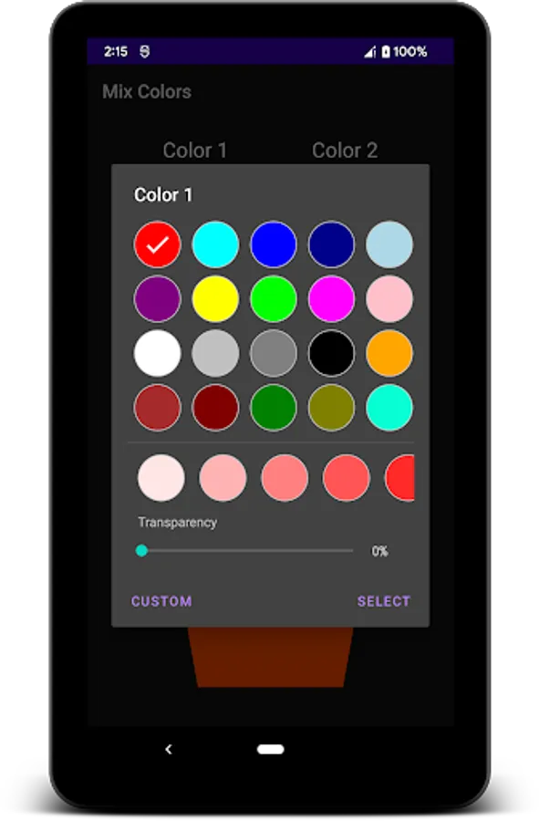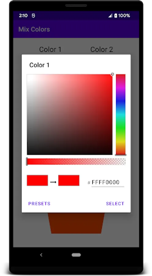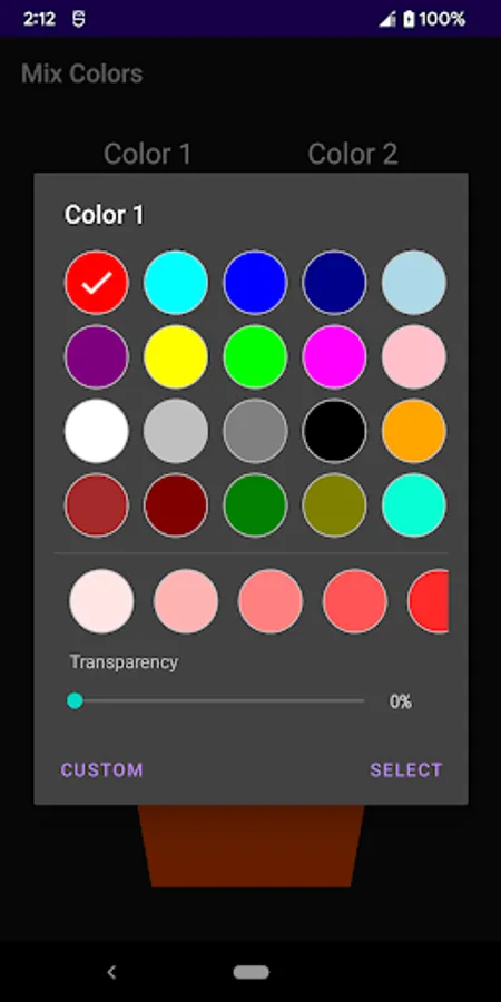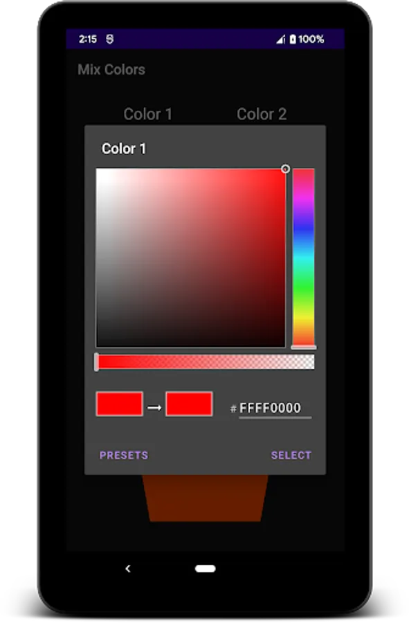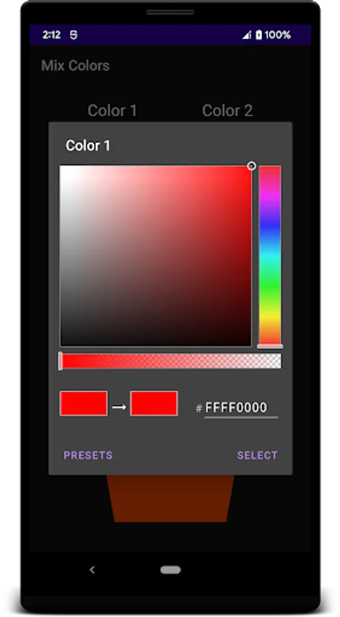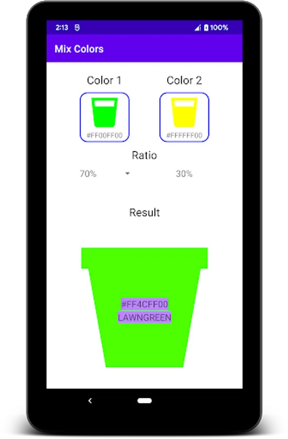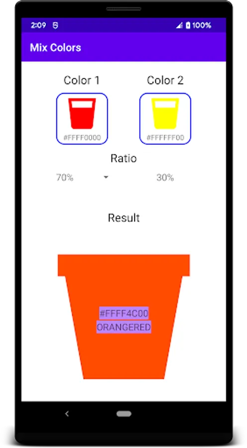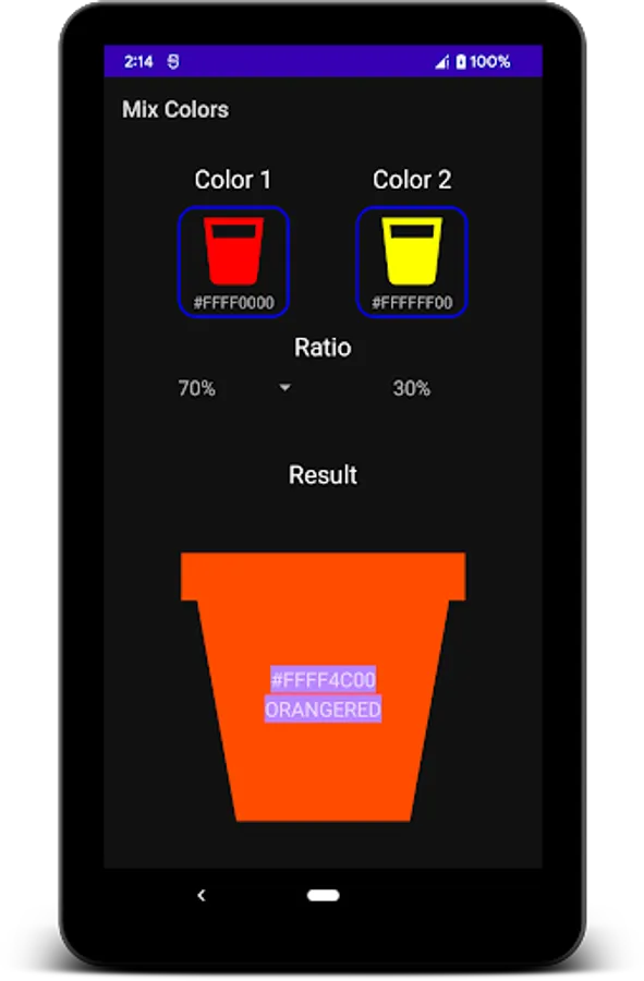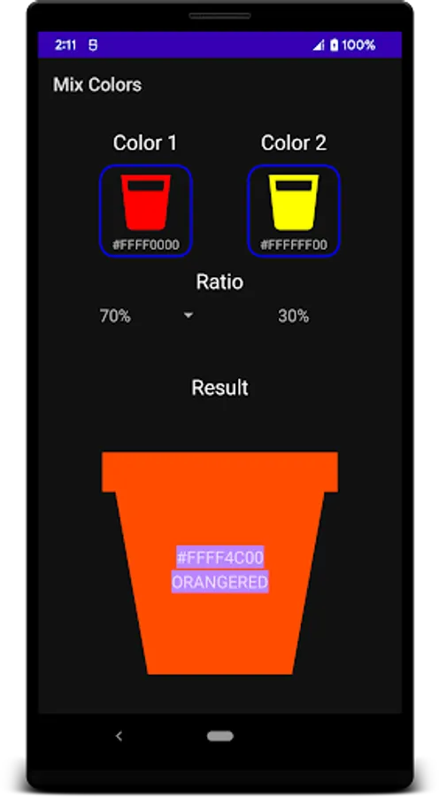 Mix Colors helps you determine the color and color code of 2 selected colors in an optional ratio.