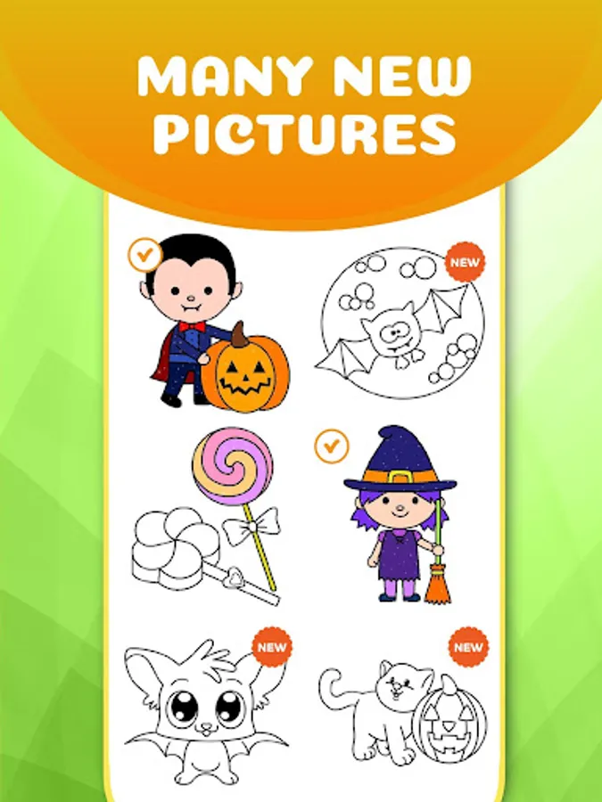 - Kids coloring games contains coloring pages in the theme of Halloween carnival party like haunted house, spider, bat, witch or even zombies.