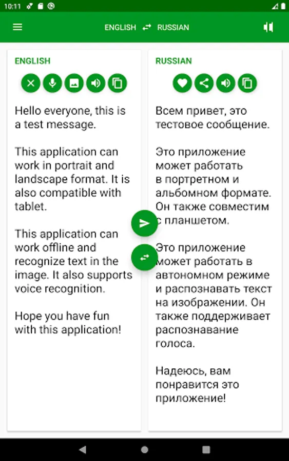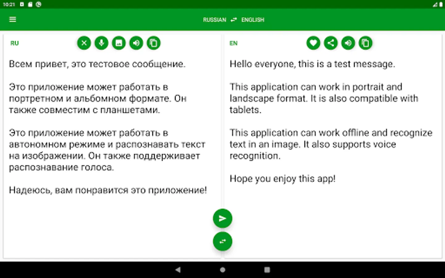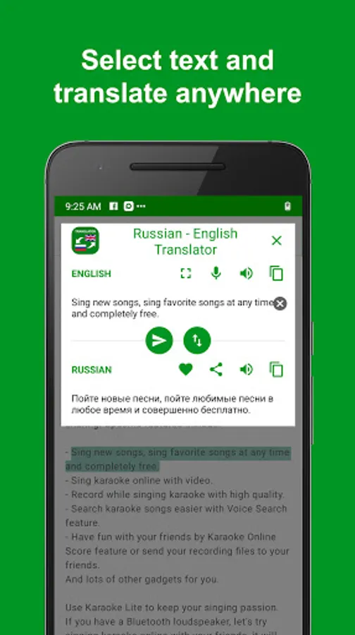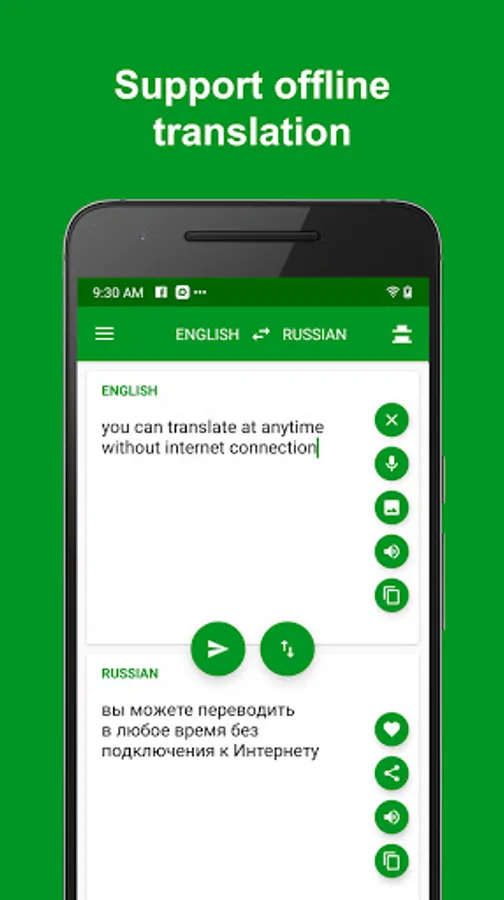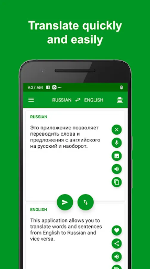 Russian - English translator is an application that help you lookup dictionary and translate words and sentences from Russian to English, or translate English to Russian too. This translator is free and you are able to translate words or sentences quickly, conveniently and easily. It also supports voice recognition.