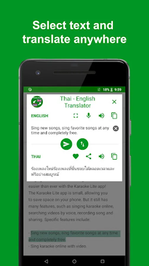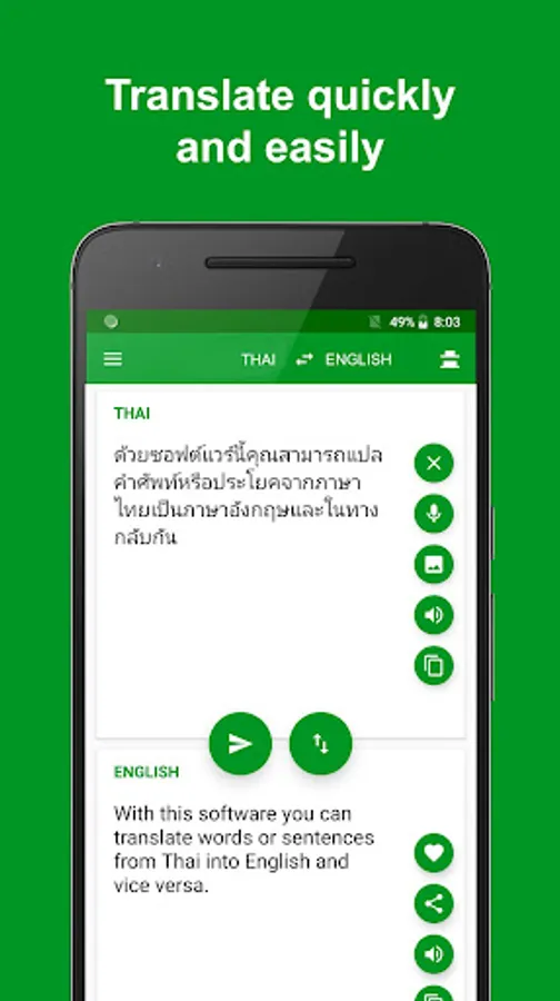 Thai - English translator is an application that help you lookup dictionary and translate words and sentences from Thai to English, or translate English to Thai too. This translator is free and you are able to translate words or sentences quickly, conveniently and easily.