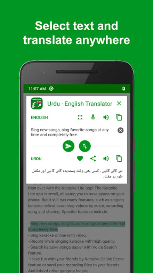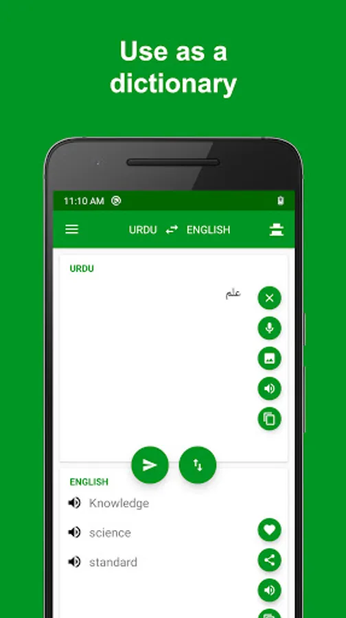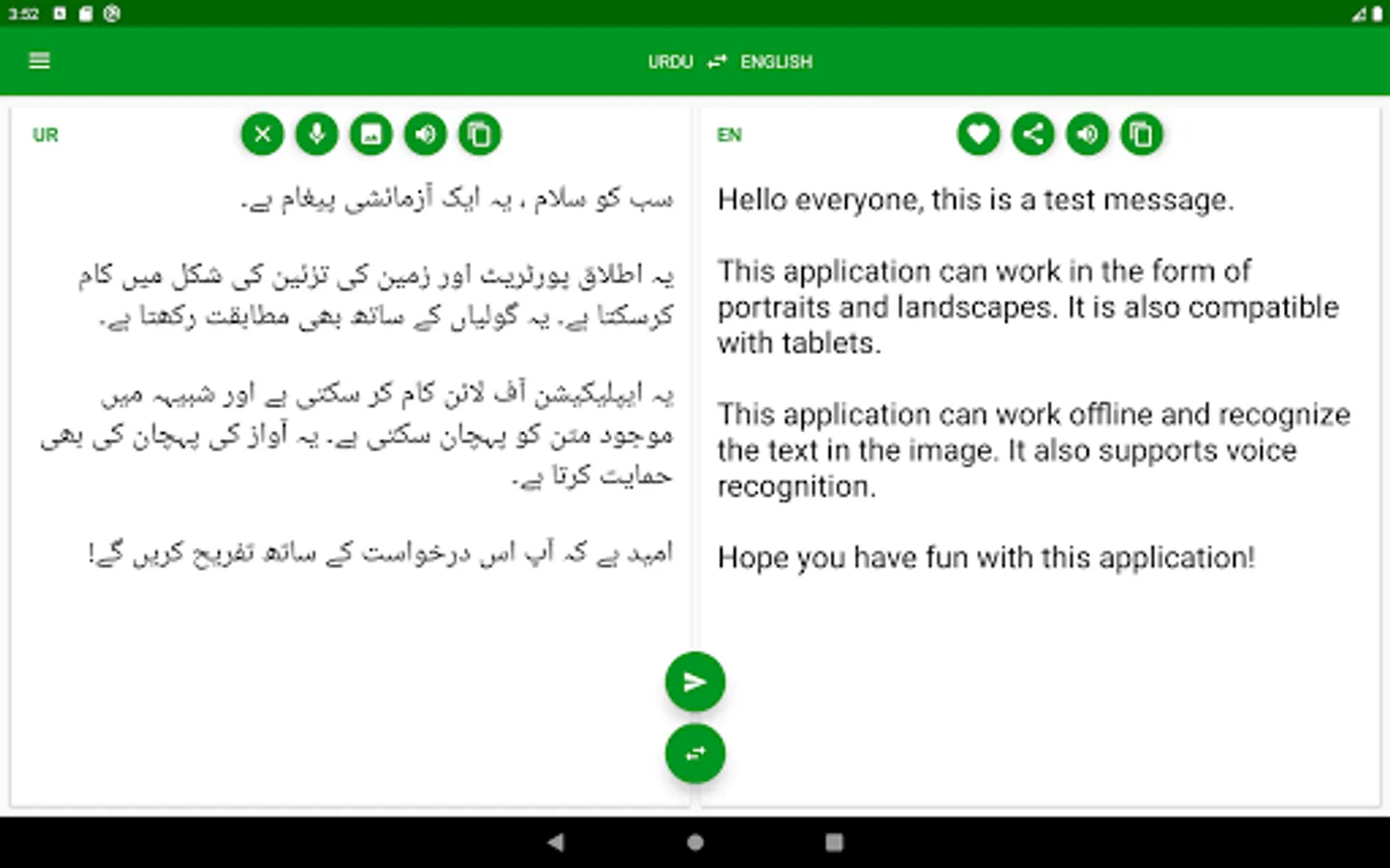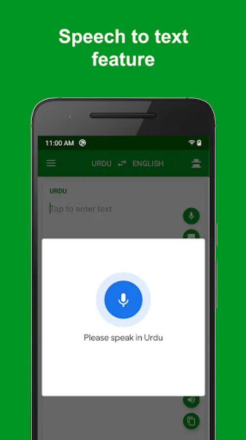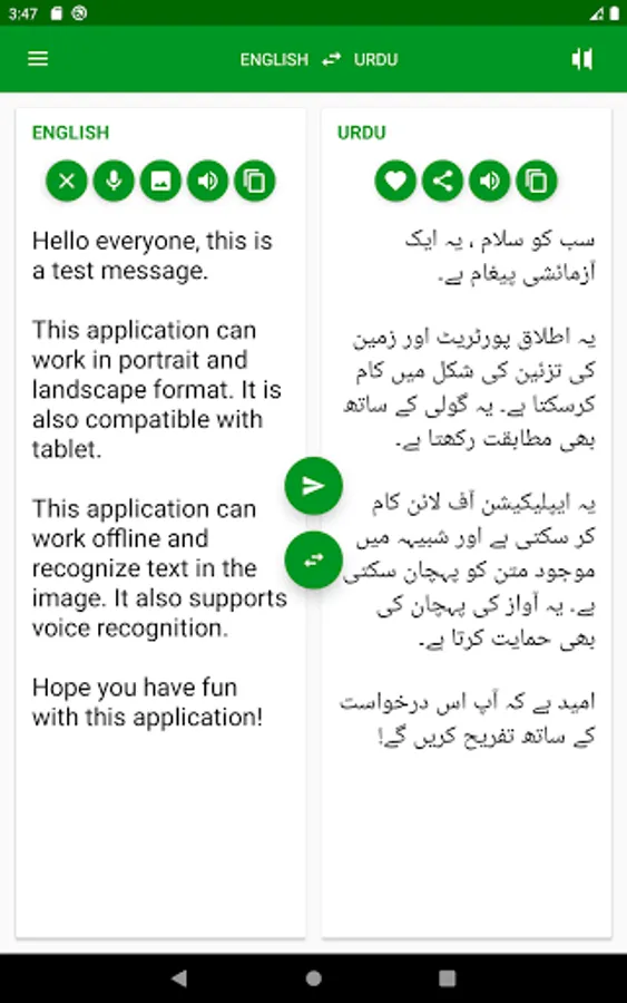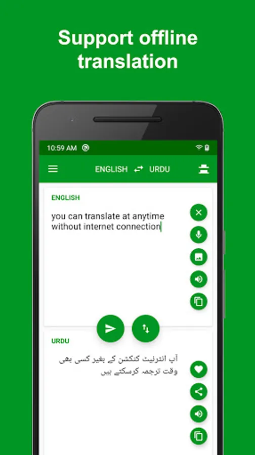 - Text to speech feature: voice broadcast of translated Urdu and English