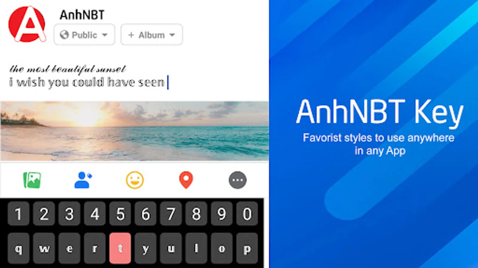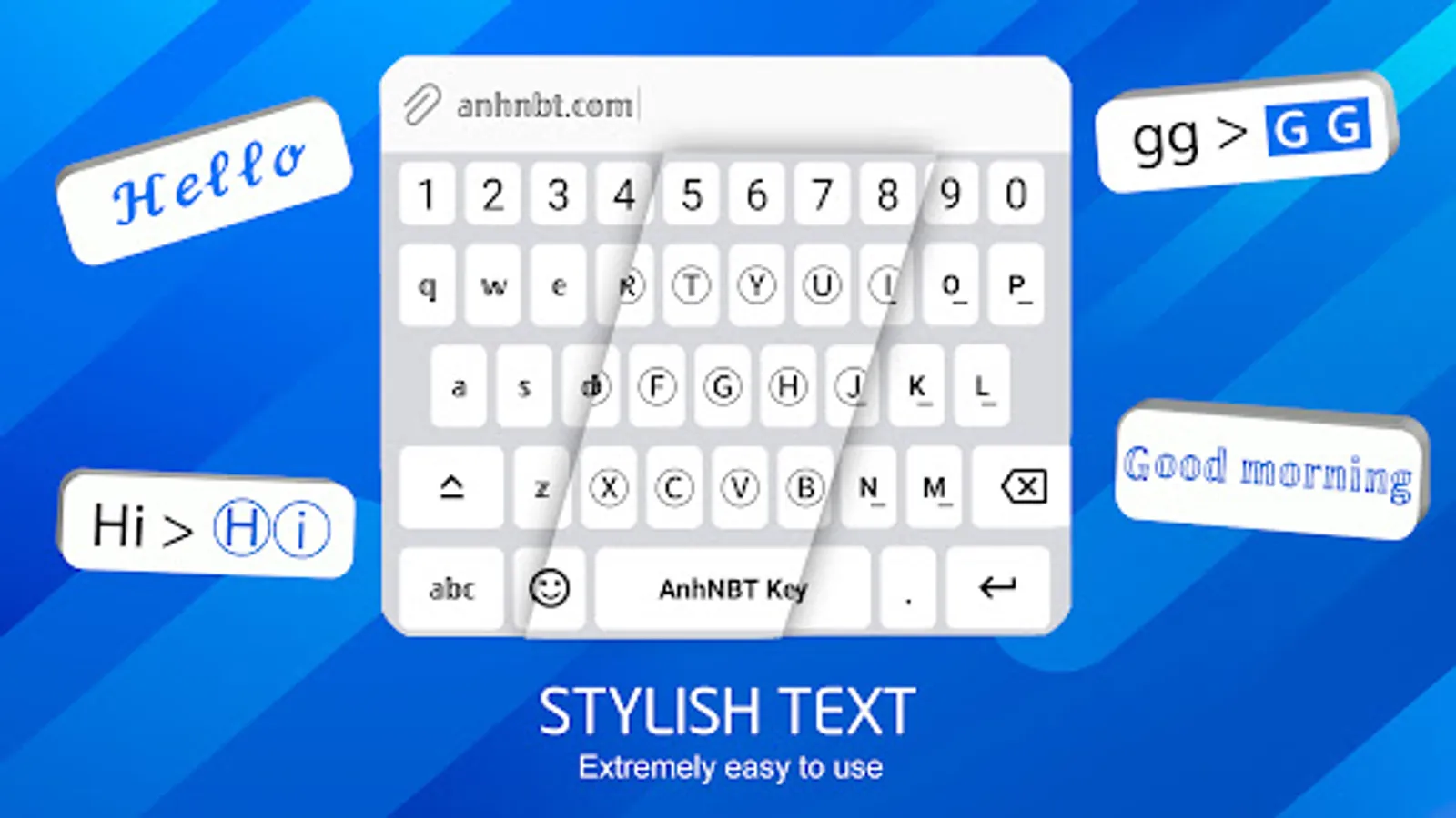 AnhNBT Key is a fancy text keyboard with hundreds of different Unicode fonts. Extremely easy to use. Just install the keyboard and type directly into other apps, no copy & paste required.