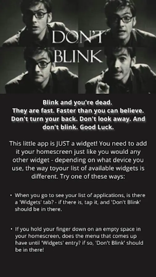 The Doctor: Don't blink. Don't even blink. Blink and you're dead. They are fast. Faster than you can believe. Don't turn your back. Don't look away. And most of all, don't blink. Good Luck.