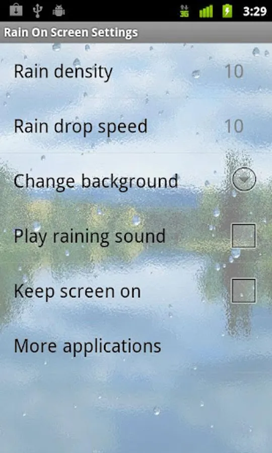 * Press HOME/MENU/Wallpaper/Live Wallpapers/Rain On Screen (free)