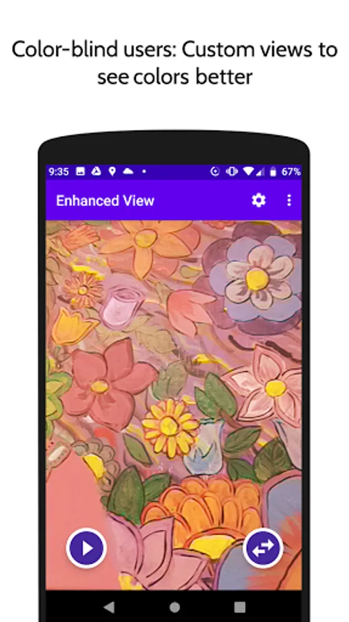 Point the phone’s camera at the landscape or objects and toggle to the enhanced view and get a personalized color enhancement. This will increase the contrast between the colors to allow you to better distinguish the colors and admire the scenery or a work of art in front of you.
