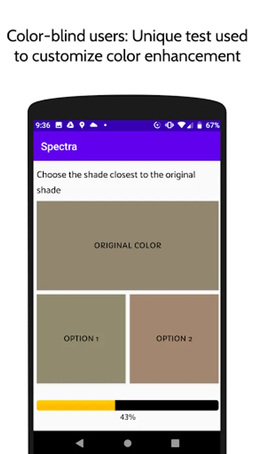 Start by taking a unique calibration test to help identify the type and severity of your colorblindness. The results will then be used to customize the color enhancements catered to the severity of your colorblindness to help you better perceive the colors.