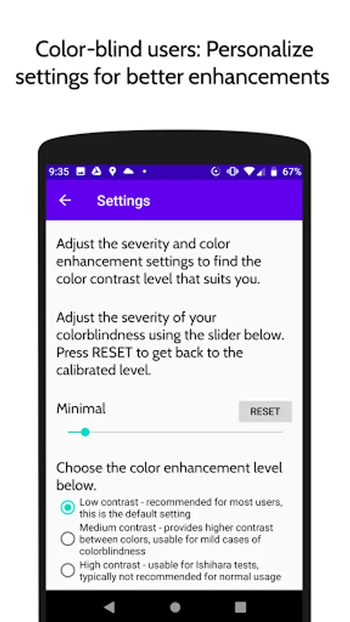 If the color enhancement is too strong or weak, you can go to settings to adjust the severity or choose a contrast level that suits you. One of these contrast levels allows you to identify the numbers hidden amongst the Ishihara color plate tests.