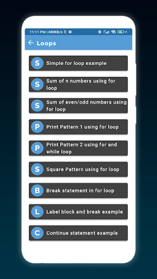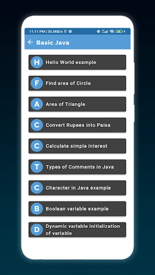 Java Programs : 500 + Java Examples has a very simple user interface. You will find it the best ever app on play store. Just install the app, open and all the basic chapters will be in front of you. Click on every chapter to see the content inside.