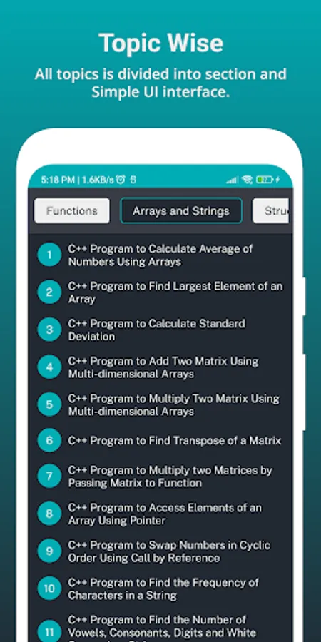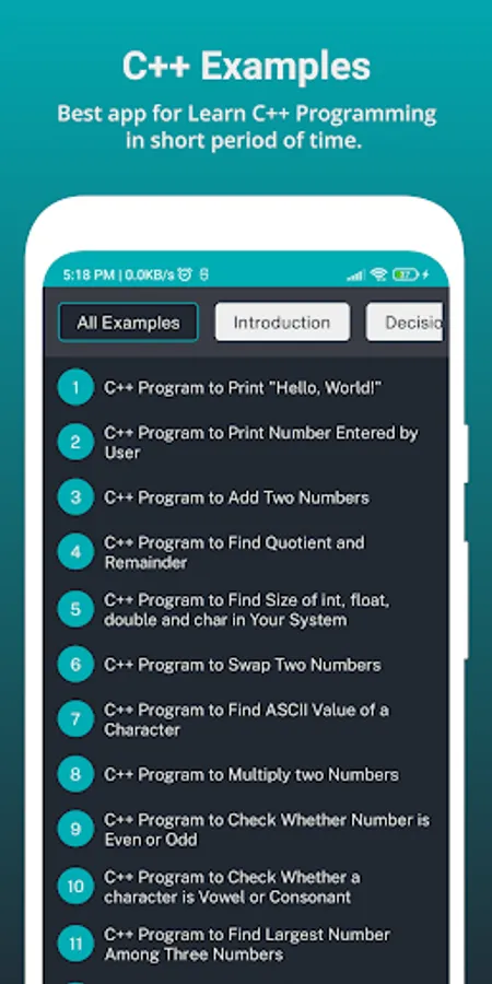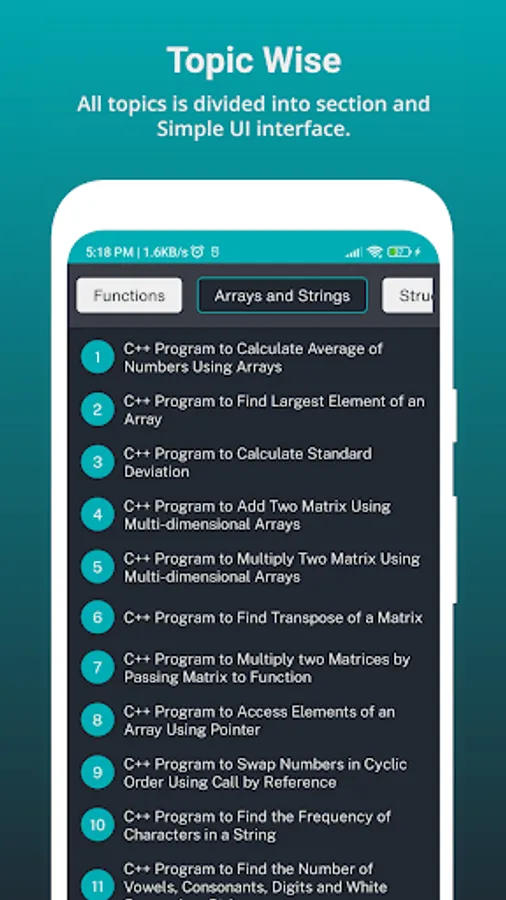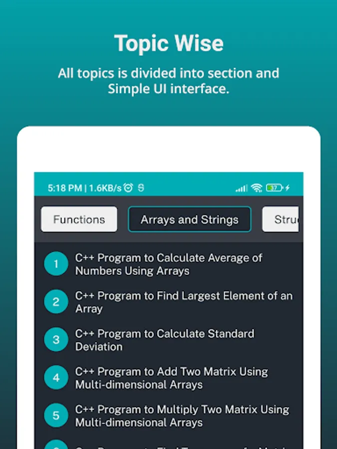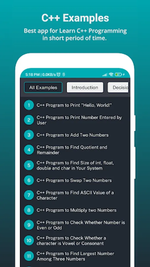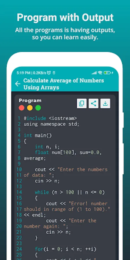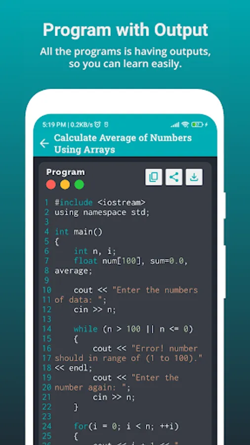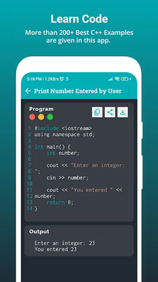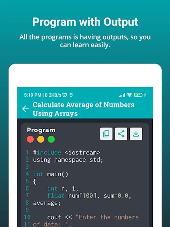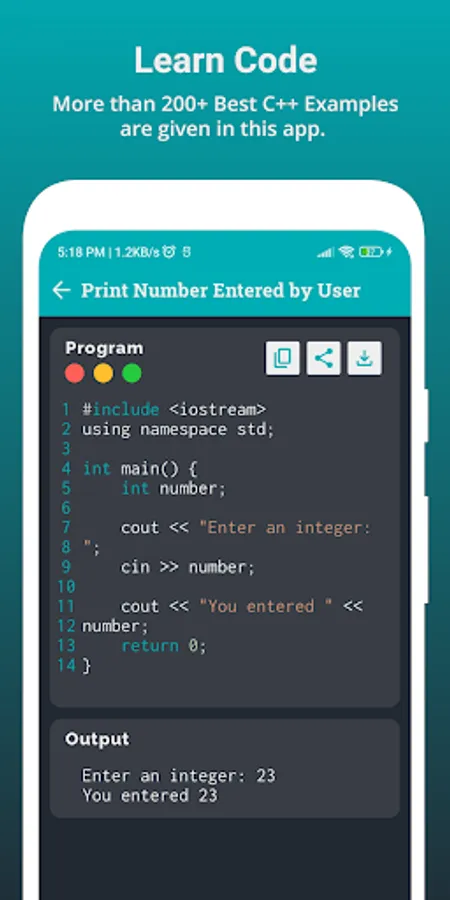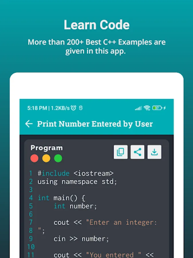 Our C++ Programs app is designed with 200+ C++ exercises with outputs.