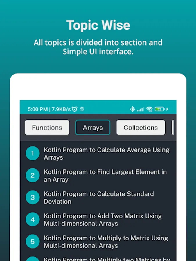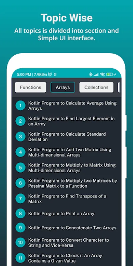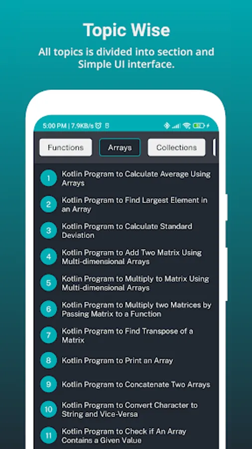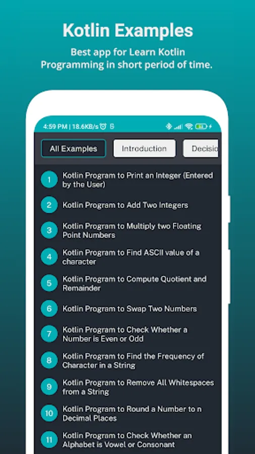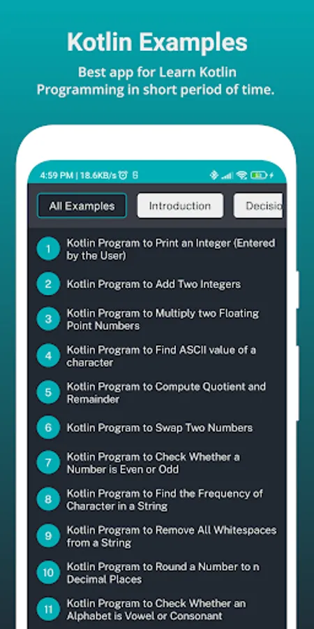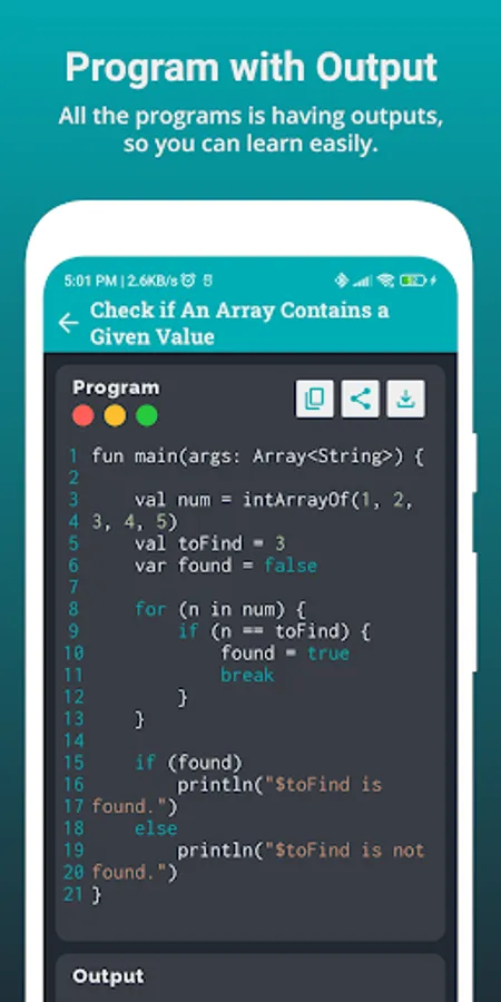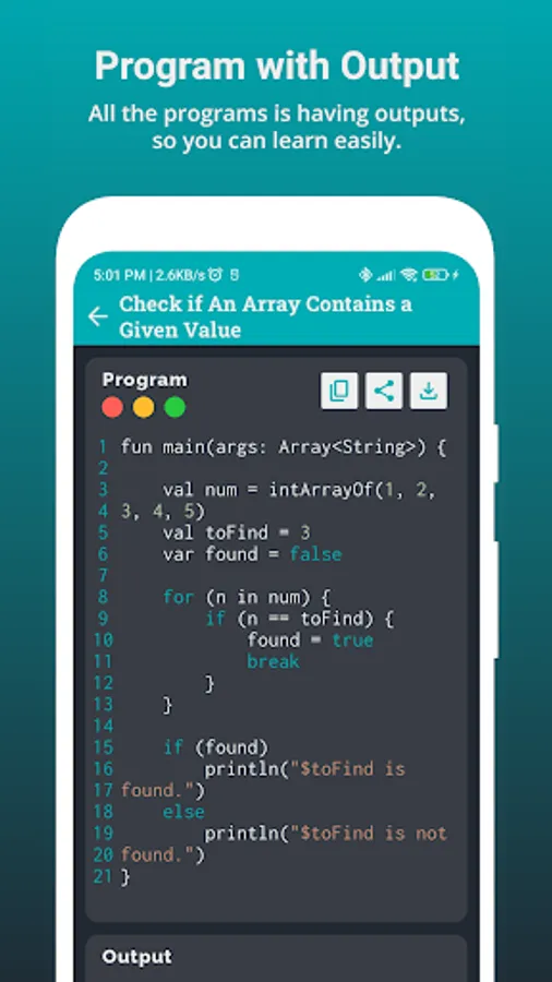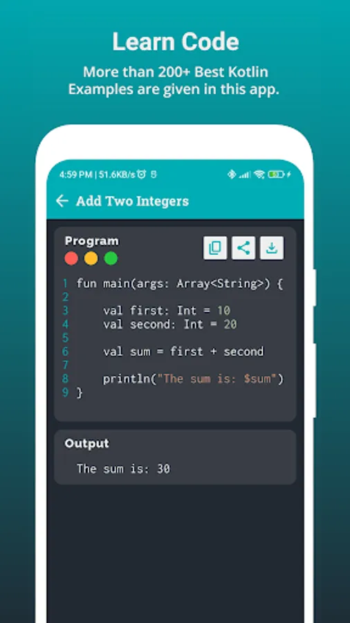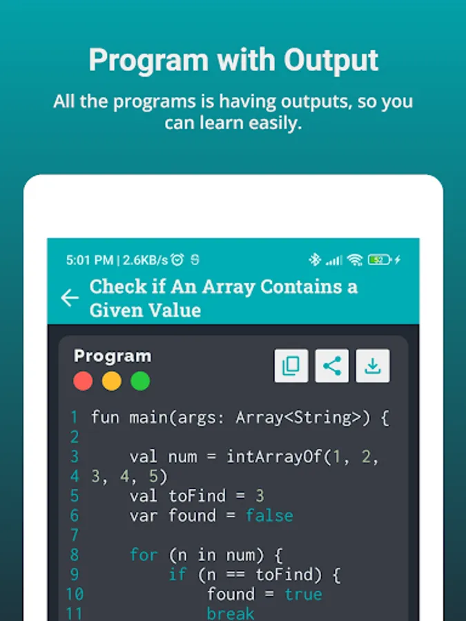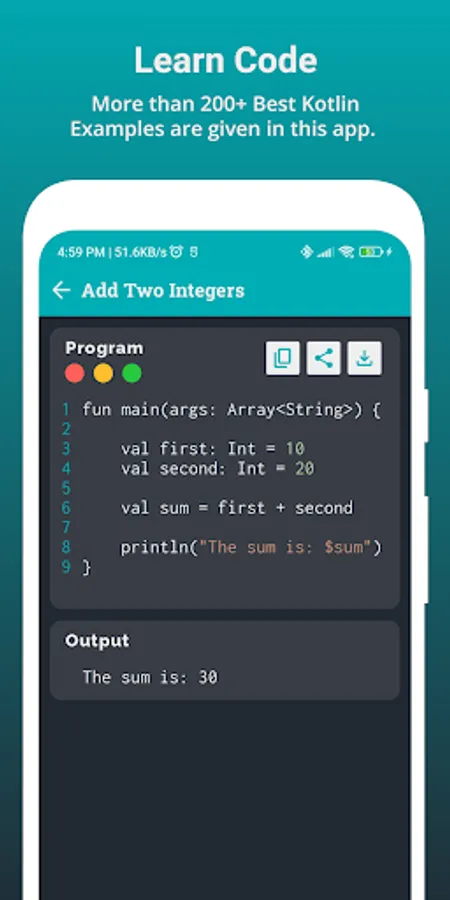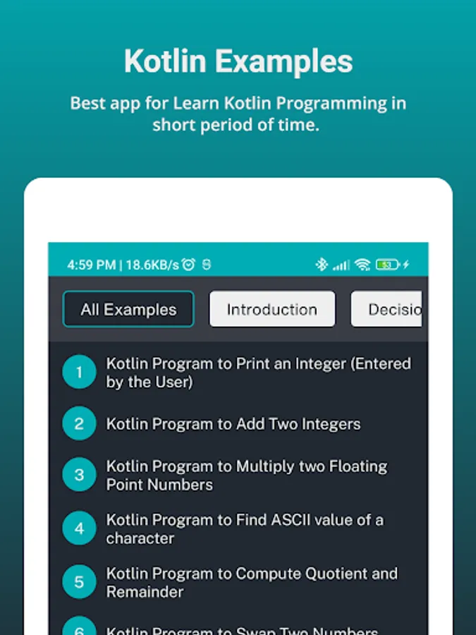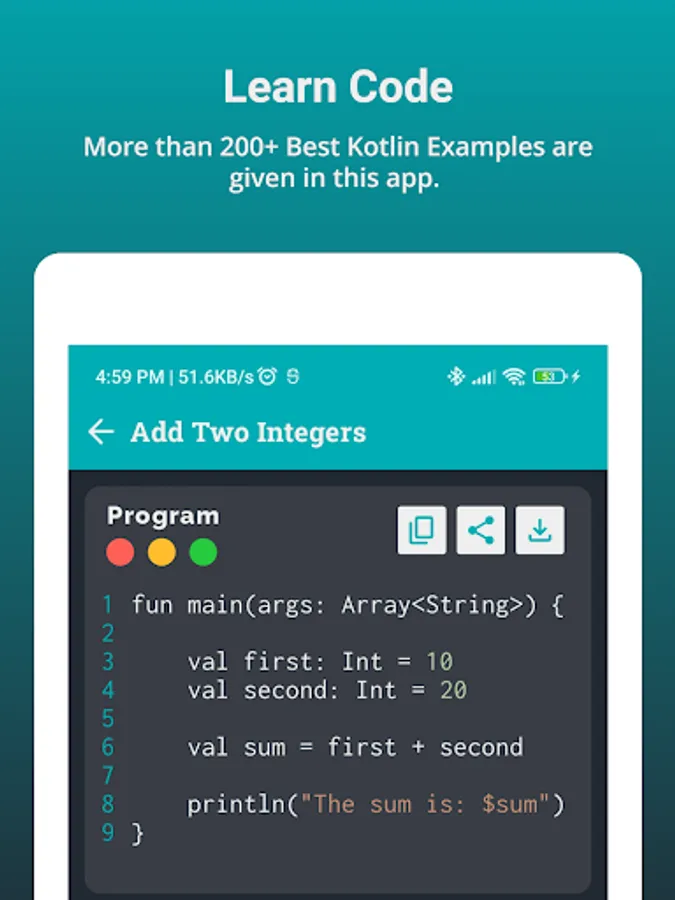 Our Kotlin Programs app is designed with 200+ Kotlin exercises with outputs.