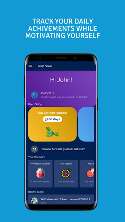 This application is here to motivate people who decides stop smoking. It is easy to use application with good looking UI to visualize your progress! It is hard to make this decision, but when you do, you need to keep moving. To keep moving you need to see what you have managed! With Quit it - Stop Smoking! you will see your progress.