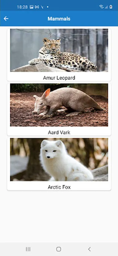This app is designed to provide informations of animals. Here is the list of animal along with photos. It is a zoo app where you can learn about animal categories.
