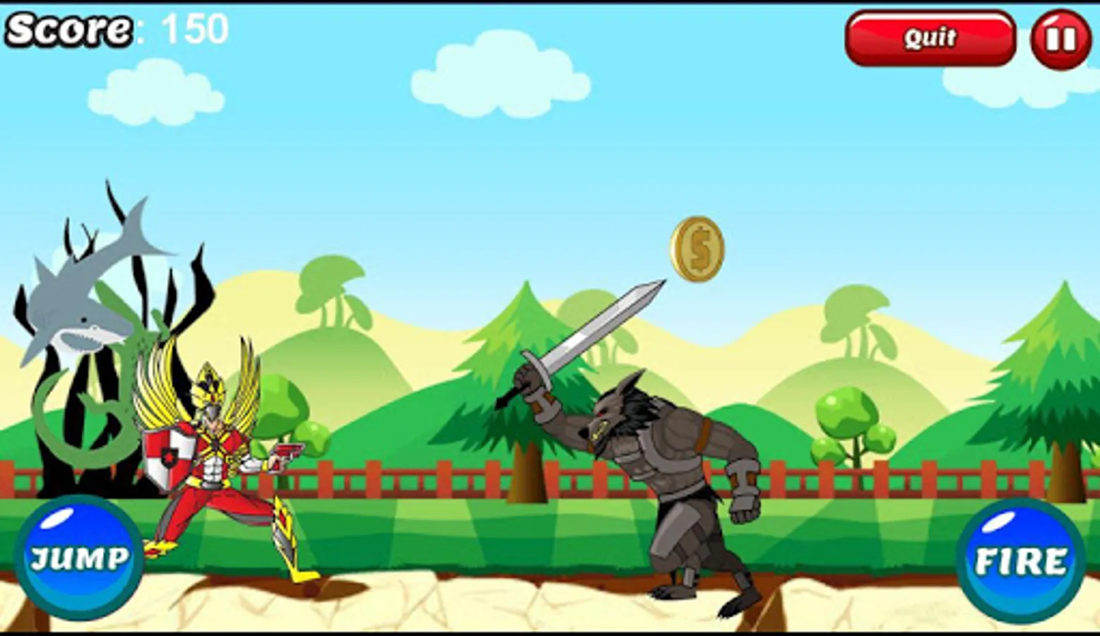Press JUMP button to jump and FIRE to shoot the enemies that incoming. We also need to collect gold coins as many as possible to enter the next level.