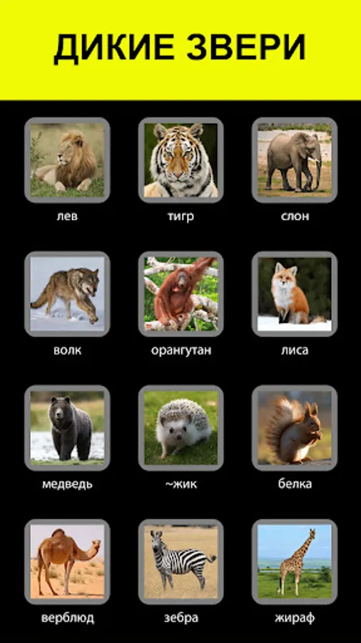 3) Wild animals contain sounds: badger, squirrel, camel, wolf, cheetah, hedgehog, giraffe, zebra, kangaroo, mole, lion, fox, bear, deer, orangutan, panther, lynx, saiga, elephant, marmot, tiger.