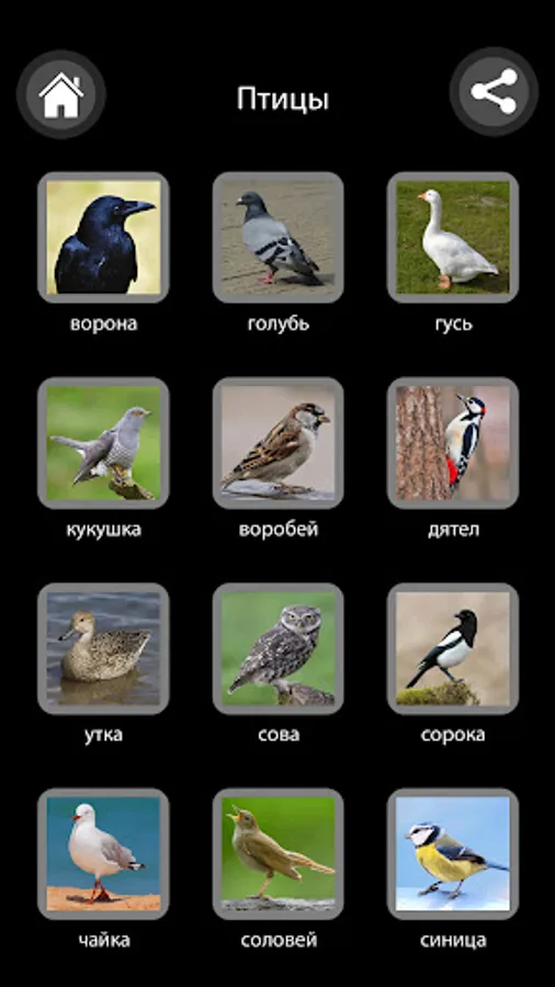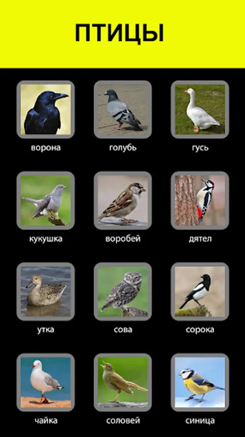 5) Voices of birds: sparrow, crow, dove, thrush, woodpecker, kite, cuckoo, swallow, eagle, peacock, titmouse, bullfinch, owl, nightingale, magpie, ostrich, flamingo, hawk, canary.