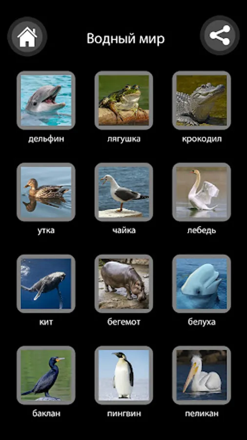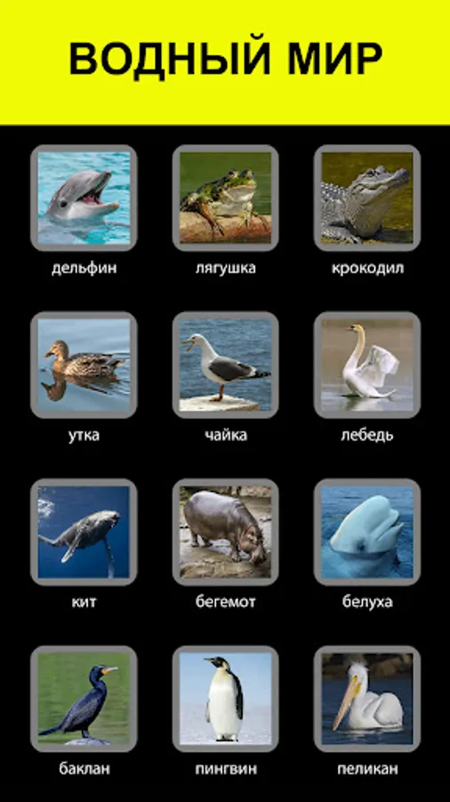 4) Aquatic life - includes: shark, cormorant, hippopotamus, beluga whale, beaver, otter, dolphin, whale, killer whale, crocodile, swan, frog, walrus, pelican, penguin, crayfish, seal, duck, heron, gull, turtle, beaver .