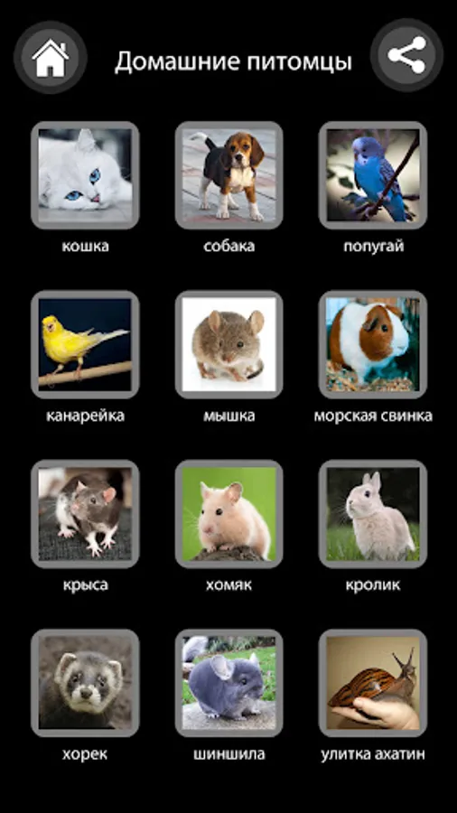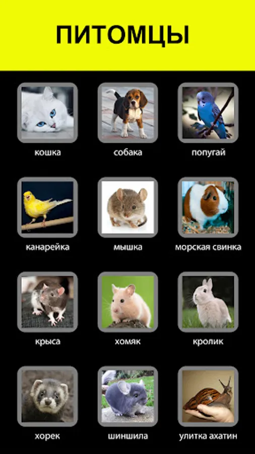 1) Pets (pets) contains sounds: cats, dogs, parrots, canaries, rabbits, rats, mice, guinea pigs, hamsters, ferrets, chinchillas.